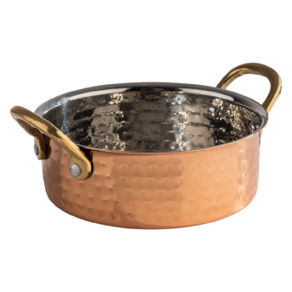 The Libbey APS 40733 Serving Pot is a versatile piece that combines aesthetic appeal with practical functionality, catering to various segments within the food and beverage industry. With a capacity of 16 oz., this pot is perfectly sized for individual servings or sharing portions, making it an ideal choice for restaurants, catering services, and hospitality venues. The pot measures 5-1/2 inches in diameter and 2 inches in height, providing a balanced proportion for both presentation and use. Its round shape and hammered finish add a touch of elegance and texture, enhancing the visual appeal of any dish it contains. Constructed from a combination of copper and aluminum, this serving pot offers both durability and a sophisticated look, suitable for upscale dining environments. The product is dishwasher safe, ensuring ease of maintenance in high-volume settings. Originating from APS Germany's Mumbai collection, the Libbey APS 40733 Serving Pot reflects a blend of international design and reliable quality. Ideal for a range of culinary applications, this serving pot is a valuable addition to any kitchen or dining service, delivering a unique presentation while maintaining practical efficiency.