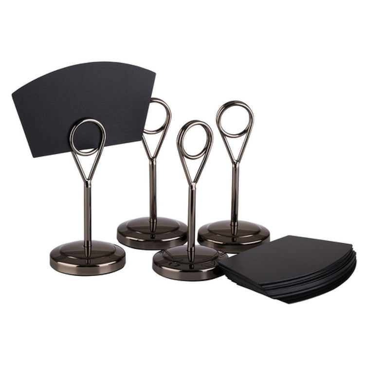 The Libbey APS 71512 Table Stand Set is a versatile 4-piece collection designed to meet diverse needs across various industry segments. Each stand measures 2 inches in diameter and stands 4-1/4 inches high, providing a compact yet effective solution for displaying information in professional settings. Constructed with high-quality stainless steel, these stands boast a durable gunmetal finish with a mirror polish, ensuring a sleek and stylish appearance suitable for upscale environments. The unique design incorporates a round shape with a double ring clip, enabling secure attachment of signage or promotional materials. This set includes twenty black polypropylene cards, adding an extra layer of functionality for customizable displays. Delivered in a case containing four units, the Libbey APS 71512 Table Stand Set is the ideal choice for restaurants, hotels, and event venues seeking an elegant and practical display solution. Its robust construction and thoughtful design provide a reliable and aesthetically pleasing option for showcasing information, making it a valuable addition to any professional setup.