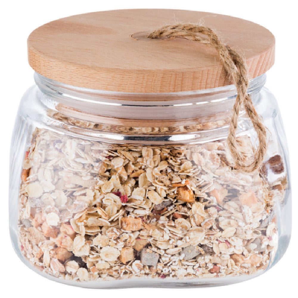 The Libbey APS 82255 Canister is a versatile storage solution featuring a 33-7/8 oz. capacity, making it ideal for various settings including home kitchens, restaurants, and cafes. With dimensions of 5-5/8 inches in diameter and 4-3/8 inches in height, this canister offers ample space for storing dry goods, ingredients, or snacks. Its round glass body is clear, allowing for easy visibility of contents, and it is dishwasher safe for convenient cleaning. The canister is designed with a unique wooden lid that includes a silicone gasket, ensuring a tight seal to preserve freshness, while the rope pull adds a touch of rustic charm. Manufactured by APS® Germany, this product is available in cases of 12, catering to both individual and bulk purchase needs. Its durable construction and aesthetically pleasing design make it a valuable addition to any kitchen or food service operation, providing both functionality and style. The Libbey APS 82255 Canister serves multiple market segments by offering a reliable and attractive storage option suited for both personal and professional use.