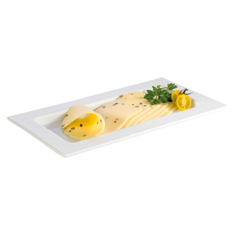 The Libbey APS 82357 Tray GN 1/3 is a high-quality porcelain tray designed for both functionality and style. Measuring 12-7/8 inches in length, 7 inches in width, and 7/8 inches in height, this rectangular tray is an ideal solution for diverse serving and display needs within the hospitality industry. Its stackable nature enhances storage efficiency, making it a practical choice for busy kitchens and catering services that require space optimization. As a versatile piece, it is suitable for use in microwave ovens and is dishwasher safe, ensuring ease of cleaning and maintenance. The tray is crafted in a classic white finish, allowing it to seamlessly complement any table setting or presentation. Produced by APS® Germany, the tray is part of a robust line of professional-grade service ware. Each case contains 16 trays, providing ample quantity for large events or establishments. The Libbey APS 82357 Tray is an exemplary choice for restaurants, hotels, and catering services that value durability and aesthetic appeal in their service pieces.