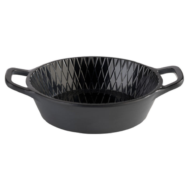 The Libbey APS 84778 Bowl is a versatile and practical choice for various segments within the food service industry. With a compact capacity of 2-3/8 ounces, it is ideally suited for serving small portions, making it perfect for appetizers, side dishes, or desserts. Measuring 3-3/8 inches in length, 4-5/8 inches in width, and 1 inch in height, this bowl is designed to fit seamlessly into any tabletop arrangement. Its round shape, coupled with dual handles, enhances its functionality, allowing for easy handling and serving. The stackable design maximizes storage efficiency, which is crucial for busy kitchens with limited space. Constructed from durable melamine, the bowl offers the appearance of hammered metal in a sleek black finish, providing a sophisticated aesthetic that complements a variety of dining settings. Its dishwasher-safe feature ensures quick and easy cleanup, maintaining hygiene standards in fast-paced environments. Manufactured by APSĀ® Germany, this mini bowl is available in cases of 60, catering to the needs of restaurants, catering services, and other food establishments. The Libbey APS 84778 Bowl is an excellent choice for those seeking a blend of style, durability, and practicality in their food presentation solutions.