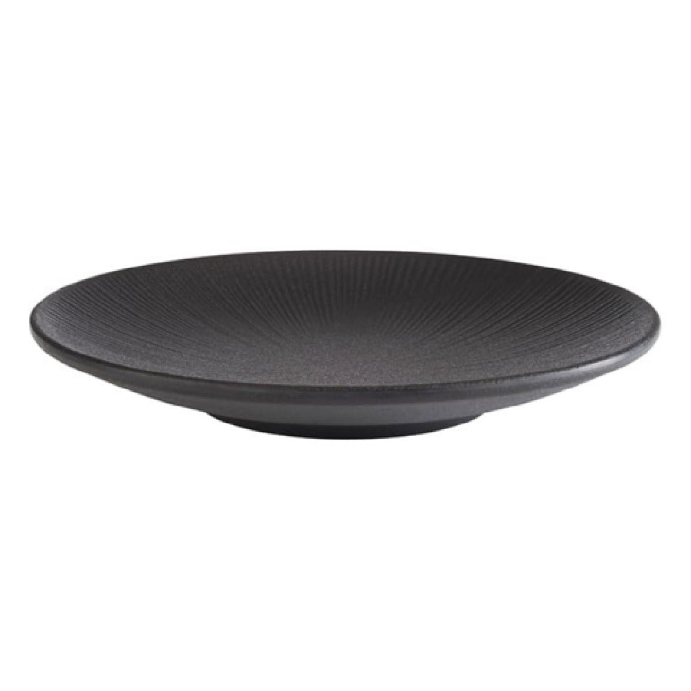 The Libbey APS 85063 Nero Plate, measuring 8-1/4 inches in diameter and 1-1/8 inches in height, is a versatile and durable choice for various dining environments. Constructed from high-quality melamine, this round plate is designed to be stackable, making it ideal for space-saving storage in both commercial and residential settings. Its ribbed texture and soft matte black finish add an elegant touch to any table setting, appealing to upscale restaurants, casual dining, and catering businesses alike. The plate's scratch and shock-proof nature ensure longevity and resilience, suitable for high-volume usage. Additionally, it is acid resistant and dishwasher safe, simplifying maintenance and ensuring consistent performance. Manufactured by APS Germany, this plate combines practicality with aesthetic appeal, serving as a reliable option for establishments seeking both function and style. Each case includes one plate, providing an opportunity for businesses to tailor their inventory to specific needs. The Libbey APS 85063 Nero Plate's blend of functionality, durability, and contemporary design offers a unique value proposition across diverse market segments within the hospitality industry.