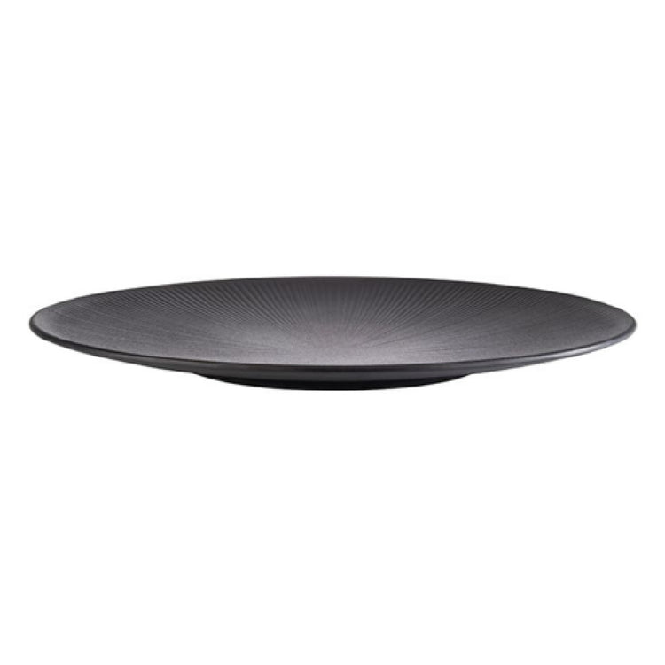 The Libbey APS 85066 Nero Plate is a versatile round dish measuring 16-1/2 inches in diameter and 1-3/8 inches in height, perfectly suited for diverse culinary settings. Crafted from resilient melamine, it boasts exceptional durability, being scratch and shock-proof, which ensures longevity in high-traffic environments such as restaurants and catering services. Its acid-resistant nature further enhances its suitability for a wide range of food presentations. This plate's stackable design allows for efficient storage, making it a practical choice for kitchens with limited space. The Nero Plate features a refined black color with a ribbed texture and a soft matte finish, adding a touch of elegance to any dining experience. Dishwasher-safe, it ensures easy maintenance and cleaning without compromising its aesthetic appeal. Produced by APS Germany, this plate encapsulates quality and style, making it an excellent choice for professional chefs and home cooks alike who seek to elevate their presentation while ensuring practicality and endurance in their tableware. Each plate is packed by the case, reflecting its premium quality and attention to detail. The Libbey APS 85066 Nero Plate is an outstanding option for those in the foodservice industry seeking reliable, stylish, and functional dinnerware.