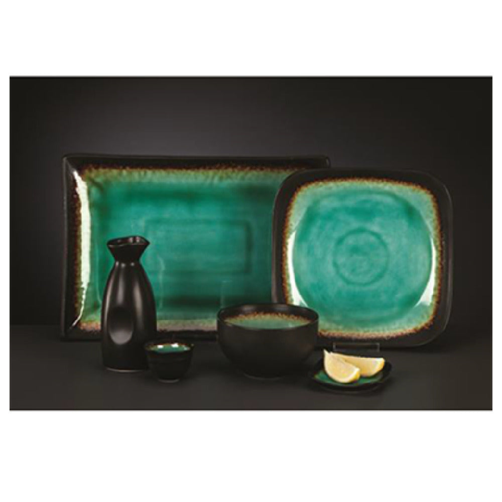 The Libbey BF-9 (formerly World Tableware) Sake Bottle is a uniquely designed piece, perfect for serving traditional beverages in both casual dining and upscale restaurant settings. This sake bottle holds up to 9 oz., offering an ideal volume for sake service. It measures 2-5/8 inches in diameter and stands 6-1/8 inches tall, ensuring a comfortable grip and easy pourability. The bottle is crafted from glazed ceramic, which not only adds a touch of elegance but also provides durability and resistance to wear over time. The turquoise color with a dark brown rim of the Hakone design brings a sophisticated aesthetic that complements various table settings. This product is packaged 12 per case, catering to bulk purchase requirements for restaurant supply needs or retail opportunities. The Libbey BF-9 sake bottle represents a blend of functionality and artistic craftsmanship, making it a versatile and attractive choice for different market segments looking to enhance their beverage presentation, from Japanese-themed eateries to modern dining establishments. Its thoughtful design and high-quality construction offer practical advantages alongside an appealing visual statement.