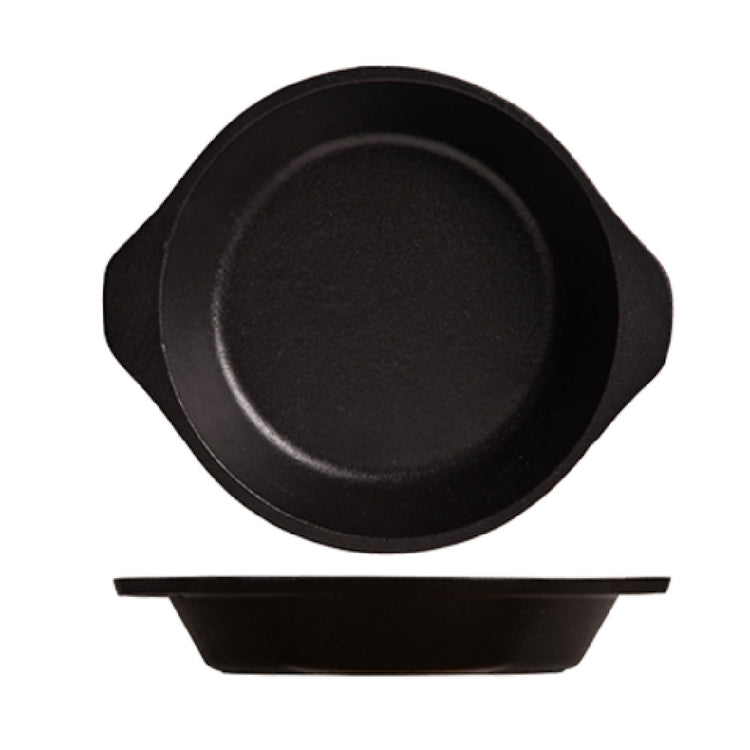 The Libbey CIS-17 (Formerly World Tableware) Pie Plate is a meticulously designed piece, ideal for various culinary applications. With a top diameter of 7-1/2 inches and a bottom diameter of 6-1/2 inches, this round pie plate offers ample space for baking and serving. The plate stands at a height of 1-1/4 inches, providing just the right depth for a variety of pie recipes. Constructed from durable cast iron, the Libbey CIS-17 ensures even heat distribution, which is critical for achieving perfectly cooked pies. Its sleek black finish not only enhances its aesthetic appeal but also complements any kitchen decor. Thoughtfully designed with handles, this pie plate allows for safe and convenient handling, especially when transferring from oven to table. Packaged as six per case, it is a practical choice for both professional kitchens and home bakers who value quality and efficiency. This pie plate is particularly suitable for the food service industry, catering businesses, and culinary schools, where reliability and performance are paramount. The Libbey CIS-17 pie plate combines functional design with robust construction, making it a valuable addition to any collection of baking essentials.