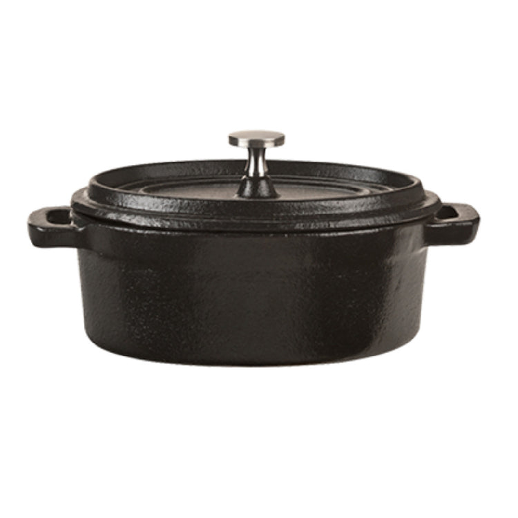 The Libbey CIS-27 (Formerly World Tableware) Miniature Dutch Oven 11 Oz. offers a unique and versatile solution for culinary professionals seeking a compact yet functional cooking vessel. Measuring 6-1/4"L x 3-5/8"W x 3"H, this miniature Dutch oven is designed with a 2-1/2" x 3-7/8" foot, providing a stable base for cooking and serving. Its oval shape is complemented by a tight-fitting lid, essential for retaining heat and moisture during cooking processes. Crafted from durable cast iron, this Dutch oven ensures even heat distribution and retention, making it ideal for achieving perfect results in various cooking techniques. Finished in classic black, it presents a modern aesthetic that seamlessly integrates into any kitchen or dining setting. Sold in cases of 12, this product is suited for commercial kitchens or catering events, where consistency and quality are paramount. Its compact size and robust build make it a practical choice for chefs and foodservice industry professionals looking to enhance their kitchen’s capabilities and presentation. This miniature Dutch oven is a testament to efficient design, providing the perfect balance between functionality and style for diverse market segments within the food industry.