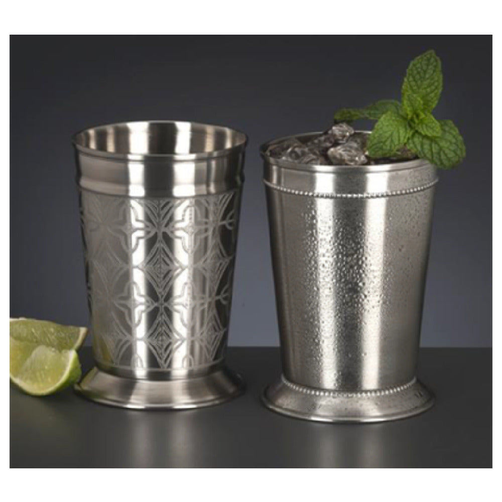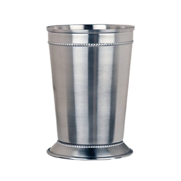 The Libbey JC-25, formerly known as the World Tableware Julep Cup, is a meticulously crafted beverage container with a capacity of 15 ounces. It features a refined beaded design, which adds a touch of elegance to its appearance, making it suitable for various settings, from upscale restaurants to intimate home gatherings. Constructed from 304 stainless steel, this julep cup boasts excellent durability and resistance to corrosion, ensuring it maintains its luster over time. With dimensions of 4-3/4 inches in height, 3-1/4 inches in top diameter, 3-1/4 inches in diameter, and a base diameter of 3-1/8 inches, it is thoughtfully designed to offer both aesthetic appeal and functional utility. These cups are packaged with 12 units per case, providing an efficient solution for businesses aiming to maintain a consistent presentation across multiple service points. The Libbey JC-25 julep cup's combination of classic design and robust construction makes it an ideal choice for various markets within the hospitality industry, including bars, hotels, and event venues, where style and durability are paramount.
