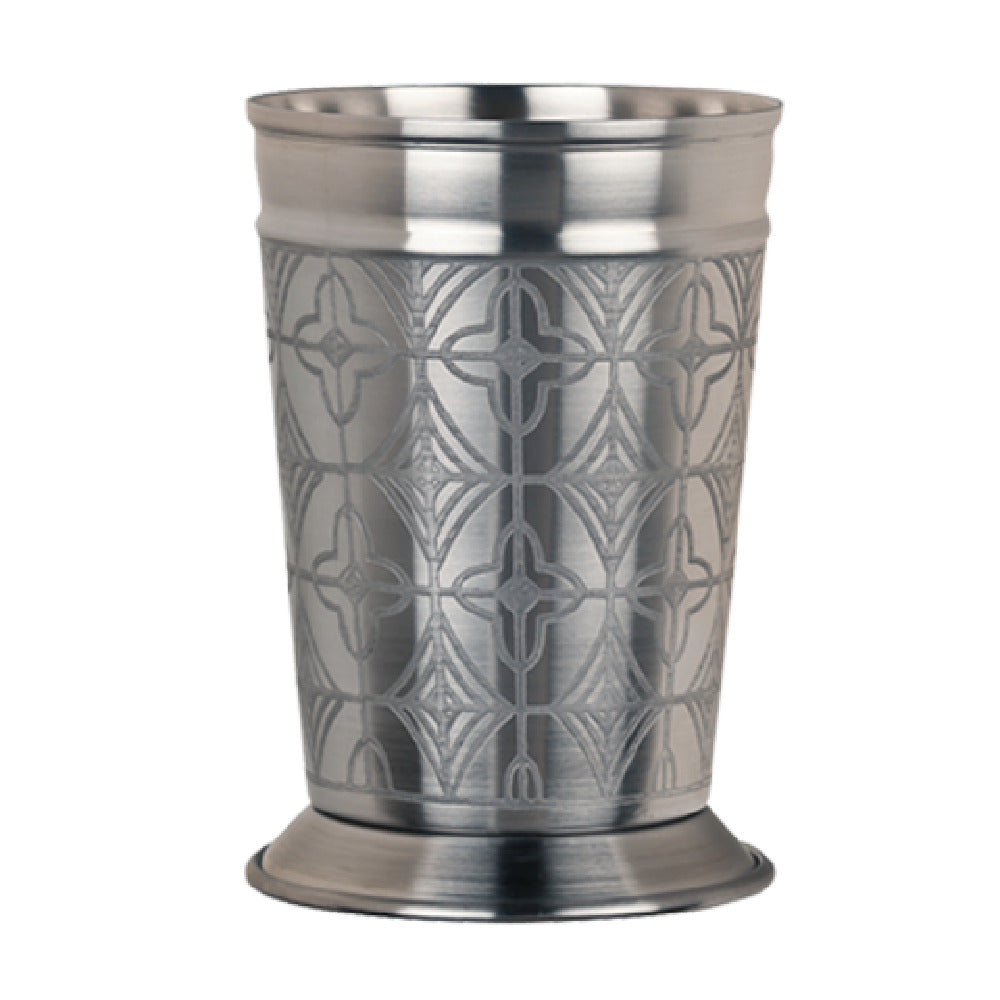 The Libbey JC-26 (Formerly World Tableware) Julep Cup 15 Oz. with Etched Design is an elegantly crafted piece, perfect for both professional and personal use. This cup is meticulously made from high-quality 304 stainless steel, ensuring durability and resistance to corrosion. It stands at a height of 4-3/4 inches with top and diameter measurements of 3-1/4 inches and a foot diameter of 3-1/8 inches, making it a well-proportioned vessel for serving the classic mint julep or any stylish cocktail. The etched design adds a touch of sophistication and charm, appealing to upscale dining establishments and home bar enthusiasts alike. Packaged in cases of 12, the JC-26 is ideal for restaurants, hotels, and catering services looking to elevate their beverage presentation. Its robust construction and aesthetic appeal make it a versatile addition to any glassware collection, providing both functionality and elegance. This julep cup is not only a practical tool for beverage service but also a decorative accessory that enhances the visual appeal of any setting. Its classic design is a nod to traditional cocktail culture, while its modern materials ensure longevity and ease of maintenance.