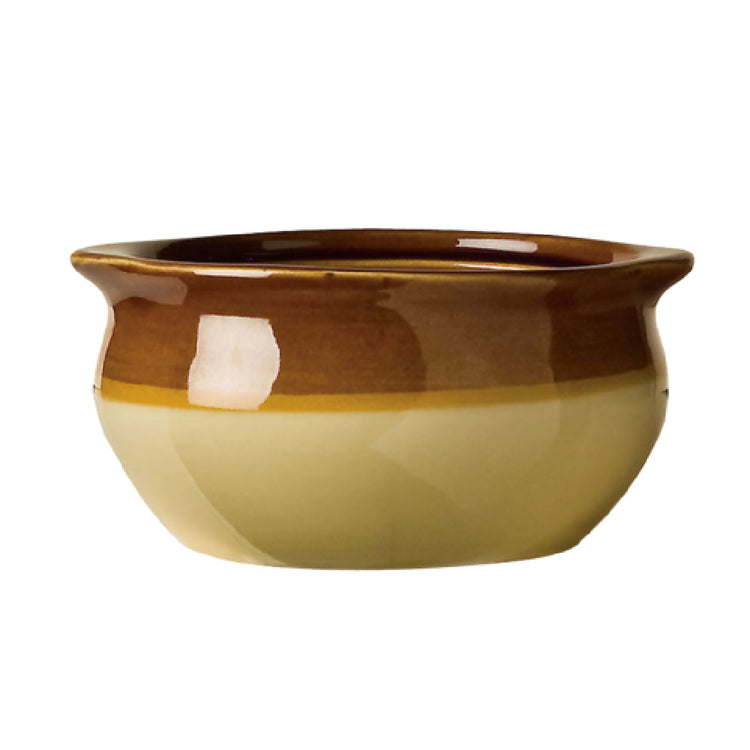 The Libbey OSC-15 Onion Soup Crock is a versatile piece of tableware designed to meet the demands of both home and commercial kitchens. With a capacity of 12 ounces, this crock is ideal for serving onion soup and other hot dishes, ensuring portion control and presentation consistency. The crock measures 5-1/8 inches in diameter and 2-1/2 inches in height, with a 3-1/4-inch diameter foot for stable placement on various surfaces. Crafted from Bedrock Ovenware, this crock is part of the Ultima® series, known for its durability and heat retention capabilities. The caramel and beige color scheme adds a touch of rustic elegance to any table setting, making it suitable for restaurants, cafes, and catering events. Packed 24 per case, the Libbey OSC-15 is an economical choice for bulk purchases in the food service industry, providing a reliable solution for high-volume dining environments. Its thoughtful design and sturdy construction make it a practical addition to any kitchen, supporting efficient service and enhancing the dining experience.