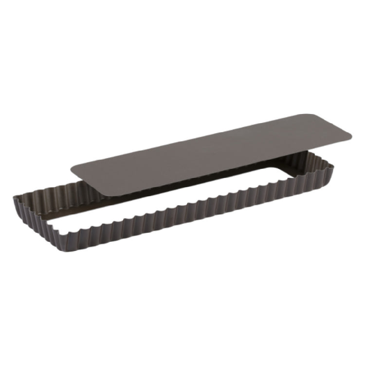 The Louis Tellier 225410 Tart Mould is a meticulously designed kitchen accessory tailored for culinary enthusiasts and professionals alike. With dimensions of 13.77 inches in width, 4.33 inches in depth, and 1 inch in height, this oblong fluted tart mould showcases a non-stick surface, ensuring effortless release of delicate baked goods. A standout feature is its removable bottom, which facilitates easy demoulding and cleaning, enhancing its practicality in both home and commercial kitchens. This tart mould is adept at creating visually appealing desserts, making it an asset for professional bakers and pastry chefs who prioritize presentation alongside taste. The non-stick coating not only aids in the smooth removal of tarts but also simplifies maintenance, underscoring its suitability for high-volume operations where efficiency is key. The Louis Tellier 225410 Tart Mould stands out as a versatile tool, combining functional design with high-quality materials to cater to a range of baking needs, whether in a bustling bakery, restaurant kitchen, or a home setting where culinary creativity thrives.