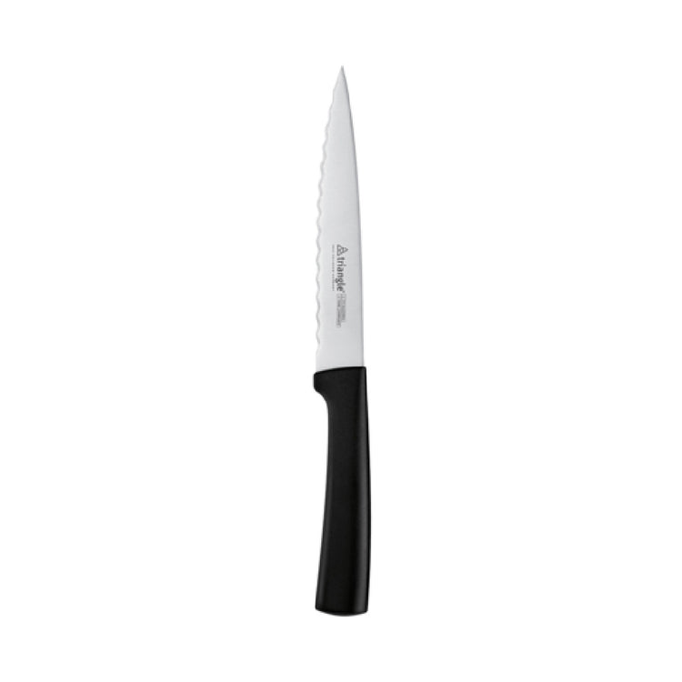 The Louis Tellier 661961610 Utility Knife - Smoothly Serrated Blister Packaged is a precision-crafted tool designed for both professional and home culinary applications. Manufactured by Louis Tellier US, this utility knife features a uniquely smoothly serrated edge, enhancing its cutting efficiency and versatility. The stainless steel construction provides durability and resistance to corrosion, ensuring long-lasting performance in various kitchen environments. This utility knife comes in a blister package, which not only protects the knife during transit but also offers a convenient retail display option for store owners. The smoothly serrated edge makes it particularly well-suited for slicing through foods with tough exteriors and soft interiors, like tomatoes or bread, making it a valuable addition to any kitchen's arsenal. Its ergonomic design allows for comfortable handling, reducing hand fatigue during prolonged use. As a versatile tool, the Louis Tellier 661961610 Utility Knife caters to diverse market segments within the culinary industry, from professional chefs to home cooks, showcasing its utility in both commercial and personal settings. This knife stands out as a practical and reliable choice, characterized by its meticulous design and premium material quality.