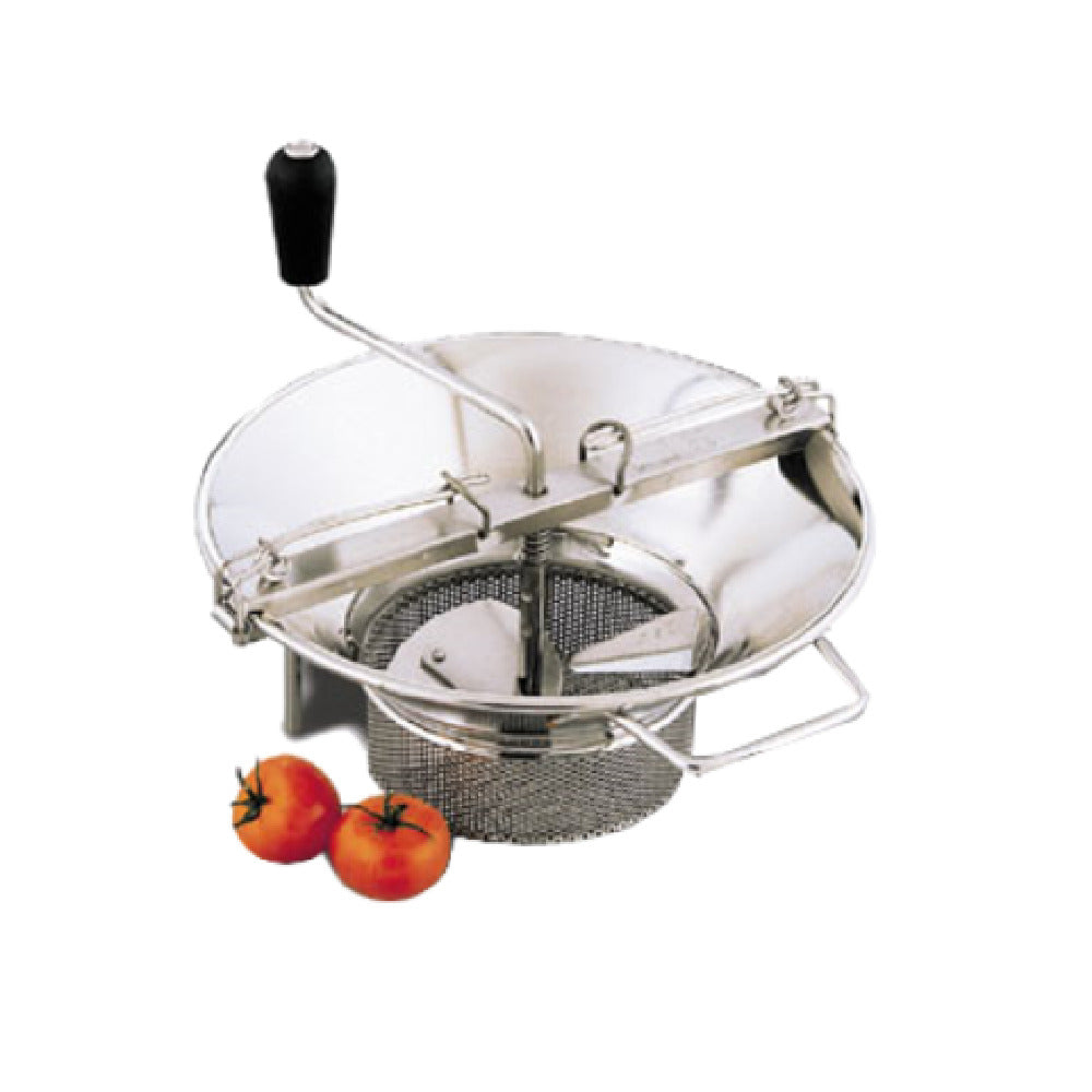 The Louis Tellier M5 Tellier Restaurant Food Mill is a robust kitchen tool designed for professional chefs and large-scale food preparation environments. With an impressive 8-quart capacity, this food mill is tailored for handling substantial quantities of produce, making it an essential asset in high-volume kitchens. Its 14-inch top diameter and 7-1/4-inch bottom diameter facilitate efficient processing of various food types, accommodating both large and small items with ease. The food mill is 14-3/4 inches deep, allowing for optimal mixing and interaction with the grid. Constructed with durable materials, it comes tin-plated to enhance its longevity and resistance to wear, ensuring consistent performance over time. One unique feature of the Louis Tellier M5 is its provision of a single grid of choice, allowing users to customize their milling experience to suit specific culinary needs. This flexibility is particularly beneficial in diverse culinary settings, from restaurants to catering services, where different textures and consistencies are required. The Louis Tellier M5 Tellier Restaurant Food Mill stands out in the culinary industry for its capacity, customizable grid option, and durable construction, offering exceptional value across various market segments, including hospitality and institutional catering services.