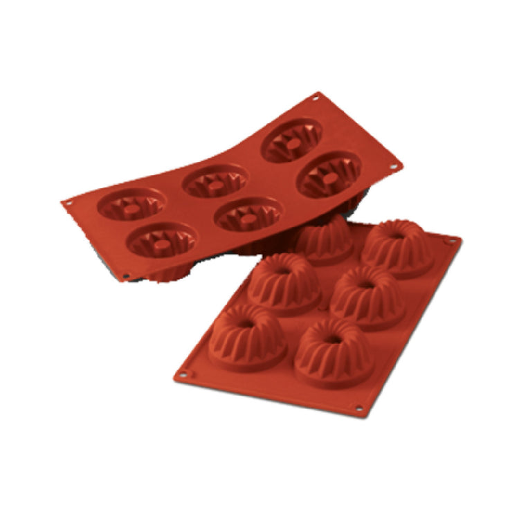 The Louis Tellier SF058 Siloconflex Mold Kougloff is an innovative baking tool crafted for culinary professionals and home bakers alike, offering precision and flexibility in creating traditional kougloff cakes. This mold features six distinct sections, each measuring 1.42 inches in height and 2.75 inches in diameter, collectively spanning an overall area of 7 inches by 11-3/4 inches. Made from high-conductivity alimentary pure silicone, the mold ensures even heat distribution, facilitating consistent baking results. Its non-toxic composition prioritizes user safety, while the non-stick surface simplifies the release of delicate baked goods, reducing the need for excessive greasing. The Siloconflex technology enhances this mold's durability, making it a reliable choice for frequent use in busy kitchens. These features appeal to a variety of markets, from artisanal bakeries seeking to expand their pastry offerings to culinary schools focused on teaching precise baking techniques. The Louis Tellier SF058 Siloconflex Mold Kougloff is more than just a baking accessory; it is an essential tool designed to elevate the baking process, combining technical efficiency with culinary creativity.