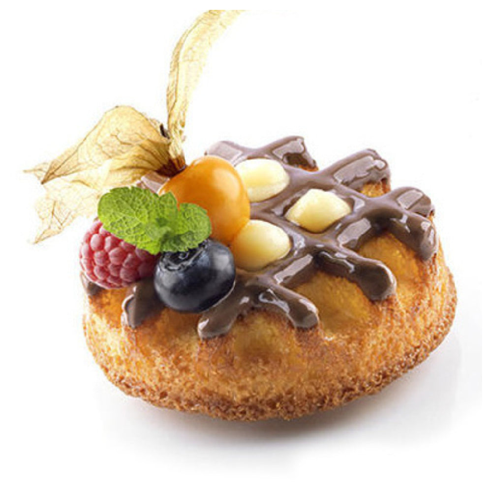 The Louis Tellier SQ051 Silikomart Mold Round Waffle Makes (18) 3.6 Oz. Pieces is a versatile kitchen tool crafted to meet the needs of both professional chefs and home cooking enthusiasts. Made in Italy, this mold is constructed from non-stick silicone, offering exceptional flexibility and durability. It is designed to create 18 perfectly sized 3.6-ounce waffle pieces in a single batch, enhancing productivity and consistency in any culinary setting. The mold's compatibility with various cooking and cleaning environments, including microwave, freezer, fan-assisted oven, and dishwasher, underscores its adaptability across different kitchen operations. This feature facilitates a seamless cooking experience, whether you're preparing breakfast in a bustling restaurant or a cozy home kitchen. The Louis Tellier SQ051's non-stick property ensures easy release of waffles, reducing the need for additional fats or oils, which is beneficial for health-conscious consumers. Moreover, its flexibility allows for effortless removal and cleaning, saving time and effort in busy settings. This product's unique combination of features makes it a valuable asset for anyone aiming to produce high-quality waffles with precision and ease, providing a practical solution for diverse culinary applications.