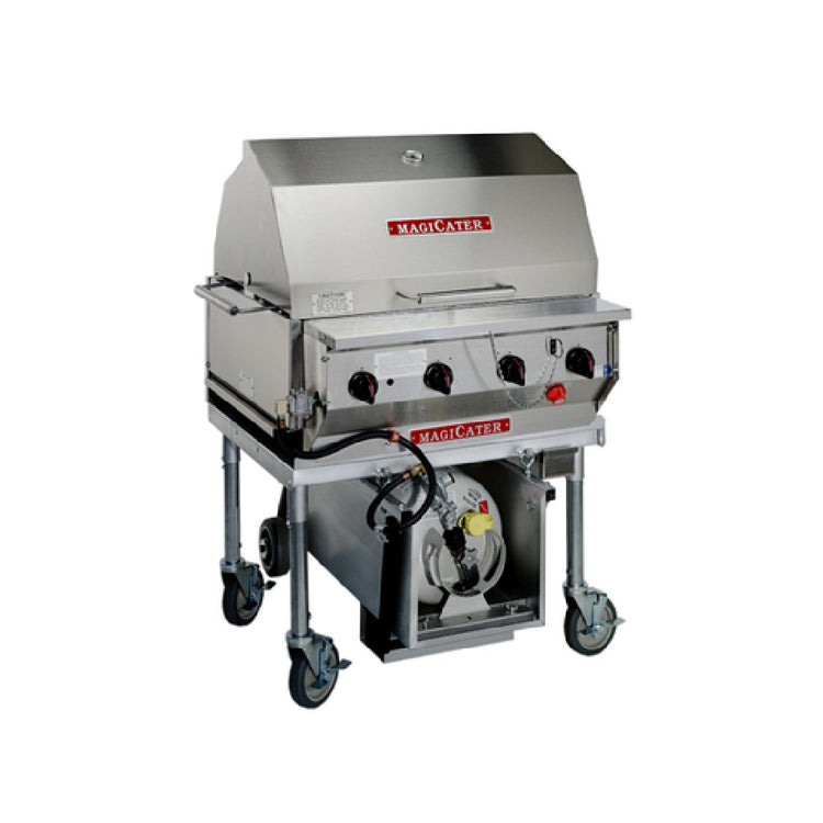 The Magikitchn LPAGA-30T-LP Magicater AGA Approved Transportable Gas Grill is a high-performance solution for diverse outdoor cooking needs, meticulously engineered to cater to various segments of the food service industry. This 30-inch grill operates on liquid propane and is powered by four burners, delivering a total of 80,000 BTU for efficient cooking. It features stainless steel radiants for enhanced heat distribution and longevity. The grill includes a nickel-chrome plated top grate, providing a durable cooking surface. An 8-inch work deck accompanies the unit, offering convenient space for meal preparation. Each burner is equipped with individual control valves, allowing precise heat management. The grill also comes with a 30-inch roll-top hood, ensuring optimal cooking conditions. For mobility, it is designed with two swivel casters and two tall casters, facilitating easy transport. The unit includes a 40-pound tank housed in a removable tank cart, along with a pressure regulator for safety. Constructed from stainless steel, this grill is robust and durable, meeting CSA Flame, CSA Star, and NSF standards, underscoring its commitment to safety and quality. The Magikitchn LPAGA-30T-LP is a versatile choice for caterers, event planners, and outdoor cooking enthusiasts requiring a reliable and transportable grilling solution.