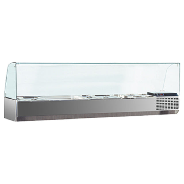 Marra Forni, GAC166, Refrigerated Countertop Condiment Rail, 65-1/2" W, (7) 1/3 pan capacity, self contained refrigeration, digital controller, automatic condensation evaporation, glass sneeze guard, 304 stainless steel interior & exterior, 1/5 HP, 115v/60/1-ph, 2.0 amps, NEMA 5-20P, cETLus, ETL-Sanitation, UL, NSF