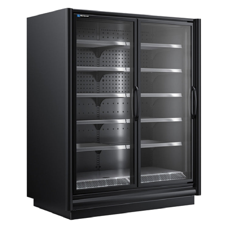The Master-Bilt BEL-2-30 Endless Low-Temperature Merchandiser-Remote-62" W is a versatile refrigeration solution designed to meet diverse merchandising needs within the industry. This unit features two 30" W hinged glass door sections, excluding the ends, providing excellent visibility and easy access to displayed products. With a total of ten shelves equipped with tag molding, it offers ample space for organizing merchandise efficiently. The use of LED lighting enhances product visibility while being energy efficient. Constructed with a painted textured galvanized steel interior and exterior, this merchandiser ensures durability and longevity. The bottom mount coil design aids in maintaining optimal low-temperature conditions, crucial for preserving perishable goods. Classified under cULus and UL EPH certifications, it meets stringent safety and sanitation standards. Proudly made in the USA, this remote merchandiser is engineered for reliability and performance, making it an ideal choice for supermarkets, convenience stores, and specialty shops aiming to showcase chilled products effectively. Its robust design and high-quality construction deliver a reliable solution for businesses seeking a dependable refrigerated display unit.