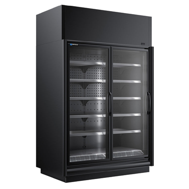 The Master-Bilt BEL-2-30CP Endless Low-Temperature Merchandiser is a self-contained unit with a width of 67 inches, making it a versatile choice for various commercial environments. It features two hinged glass door sections, each 30 inches wide, with field-reversible capabilities, allowing for flexible configuration in any setting. The doors are end-mounted, providing easy access to the contents. The merchandiser includes ten shelves with tag molding for organized display and efficient product placement. With LED lighting, it ensures products are well-illuminated, enhancing visibility and appeal to customers. Constructed with a black painted textured galvanized steel interior and exterior, the unit offers durability and a sleek finish. The top shroud, shipped loose, adds 20 inches to the height, accommodating additional components if needed. The bottom mount coil and MSLD010EB-ENQ condensing unit are key technical features, ensuring efficient cooling performance. The merchandiser is cULus and UL EPH Classified, signifying adherence to strict safety and performance standards. Proudly made in the USA, the Master-Bilt BEL-2-30CP is an excellent option for retail and foodservice industries, combining robust construction with advanced features to meet the demands of low-temperature merchandising.