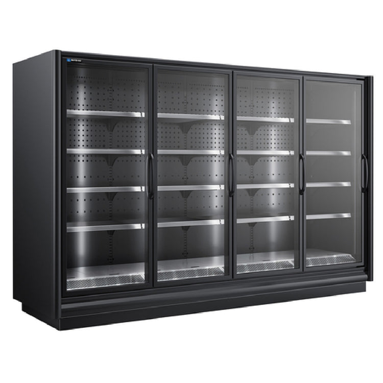 The Master-Bilt BEM-4-30 Endless Medium-Temperature Merchandiser Remote 122.88" W is a versatile refrigeration unit tailored for commercial environments requiring efficient merchandising solutions. Featuring a substantial width of 122.88 inches, this unit is equipped with four 30-inch wide hinged glass door sections, creating an expansive display area ideal for showcasing a variety of perishable goods. The design excludes end sections, optimizing space for product visibility from multiple angles. With a total of 20 cantilever shelves complete with tag molding, users can efficiently organize and label products to enhance customer accessibility and inventory management. The incorporation of LED lighting ensures energy-efficient illumination, markedly improving product presentation while reducing operational costs. Constructed with a durable painted textured galvanized steel interior and exterior, the unit promises longevity and resilience in high-traffic retail settings. The bottom-mount coil system enhances the unit's cooling efficiency, maintaining optimal temperatures for medium-range perishable items. This merchandiser meets stringent safety standards, being cULus and UL EPH Classified, underscoring its compliance with quality and safety regulations. Proudly made in the USA, the Master-Bilt BEM-4-30 stands as an exemplary choice for businesses seeking reliable, high-capacity refrigeration solutions with an emphasis on durability and energy efficiency.