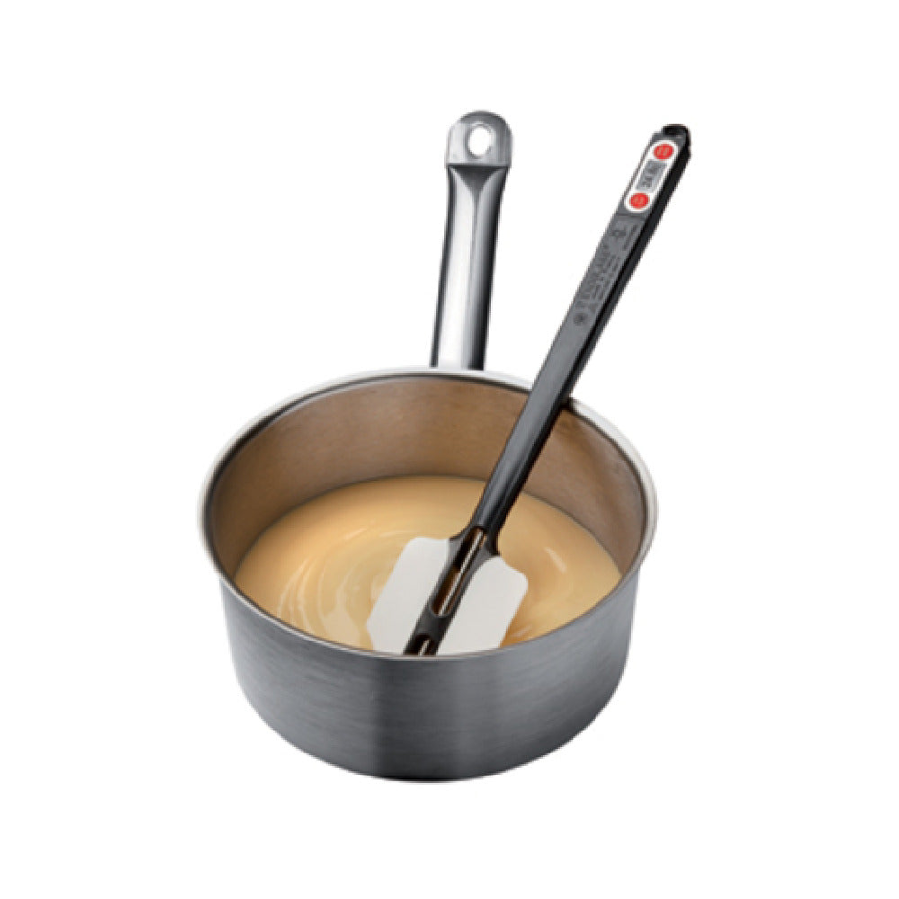 The Matfer 113092 Elvéo Thermometer Spatula is a precision tool measuring 15-1/4 inches in length, designed for culinary professionals and enthusiasts who require exact temperature measurements in their cooking processes. This innovative spatula operates over a temperature range of -20°C to 200°C (-4°F to 392°F) with a reliability of 1°C, making it ideal for a variety of cooking applications, from chocolate tempering to sugar work. The handle is temperature resistant up to 220°C (428°F), ensuring safe and comfortable usage even with high-heat tasks. Its flexible silicone paddle adds to its versatility, allowing for gentle stirring and scraping without damaging delicate surfaces. The thermometer is removable, enabling the spatula to be dishwasher safe, which adds to the convenience and ease of maintenance. This feature-rich tool is particularly valuable for pastry chefs, chocolatiers, and culinary educators who demand accuracy and efficiency in their temperature measurements. The Matfer 113092 Elvéo Thermometer Spatula stands out in professional kitchens for its dependability and thoughtful design, making it an essential equipment in gastronomy where precision in temperature control is paramount.