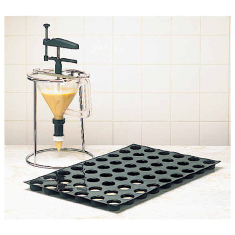 The Matfer 116605 Portion Control Funnel is an expertly designed kitchen tool ideal for precision cooking and baking. With dimensions of 16-1/2 inches in height, 10 inches in width, and an 8-5/8 inch diameter, this funnel is compact yet highly efficient. It boasts a capacity of 1-1/2 quarts, making it perfect for portioning sauces, batters, or creams with consistent accuracy. Featuring an automatic portion control mechanism, it is calibrated to dispense up to 2/3 oz per portion, ensuring uniform serving sizes. Made from durable polycarbonate, the funnel resists temperatures up to 250°F, providing excellent heat resistance and longevity. The inclusion of a chrome stand enhances stability during use, while its dishwasher-safe construction ensures easy cleaning and maintenance. Manufactured in France, the Matfer 116605 Portion Control Funnel exemplifies quality and precision, making it a valuable asset for professional chefs and culinary enthusiasts alike. Its technical design and durable build cater to various market segments within the culinary industry, from commercial kitchens to artisanal bakeries, offering a reliable solution for portion control and consistency in food preparation.