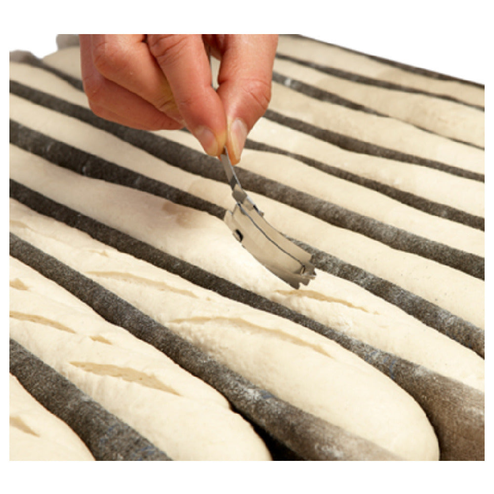 The Matfer 120032 Lam'Plus Baker's Blade is a meticulously crafted tool designed for professional and home bakers who demand precision and versatility. Measuring 5 inches in length and 1 inch in width, this stainless steel blade stands out for its unique design, which allows all four corners of the blade to be utilized, maximizing its utility and lifespan. Each corner can be used separately, offering a customizable experience based on the specific needs of the user and the task at hand. This feature makes the Lam'Plus Baker's Blade an innovative solution for various baking tasks, from scoring dough to detailed pastry work, catering to diverse segments within the culinary industry. The inclusion of a blade cover ensures safety and longevity, protecting the blade from damage and users from accidental cuts when not in use. Matfer Bourgeat's commitment to quality and functionality is evident in the durable construction of this baker's blade, making it a reliable tool for bakers seeking efficiency and precision. Its compact size combined with the multi-corner usability makes it an essential accessory for those in need of a versatile and efficient baking implement.