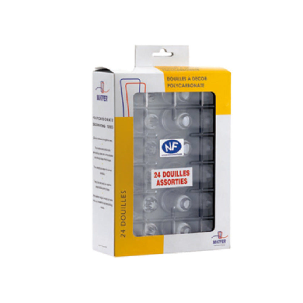 The Matfer 166003 Decorating Tube Tip Set is an exemplary tool for professional and aspiring bakers, chefs, and culinary artists, emphasizing durability and precision. This set is crafted from transparent polycarbonate, making it unbreakable and non-deformable, thus ensuring longevity and reliable performance in demanding environments. The collection includes 24 distinct pieces: 12 plain tips (U1 - U12) and 10 scalloped tips (A6, A8, B6, B8, C6, C8, D6, D8, E6 & E8), providing a wide variety of decorative options ideal for cake design and pastry embellishments. Additionally, it features a #2 leaf tip and a special tube for Yule logs, catering to specialized culinary needs. Manufactured in France, this set meets the NF Certification standards, signifying its commitment to quality and safety. This comprehensive assortment is tailored to meet the diverse needs of different market segments within the culinary industry, from small-scale bakeries to large-scale pastry operations, offering versatility and precision. The Matfer 166003 set is a quintessential addition to any kitchen, facilitating creativity and skill in pastry decoration, while ensuring robustness and reliability through its non-deformable design.