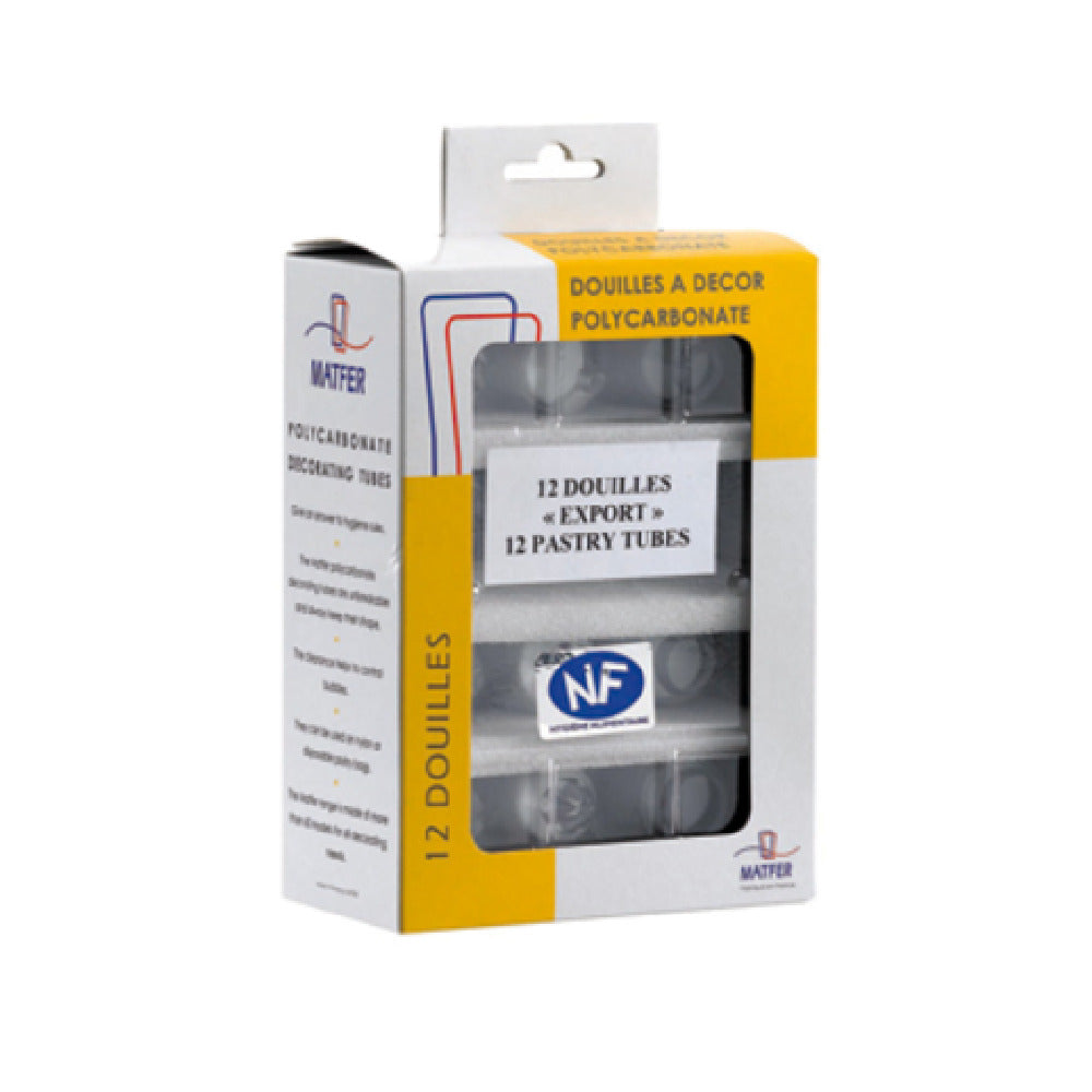 The Matfer 166004 Decorating Tube Tip Set is an innovative and essential tool for culinary professionals and enthusiasts alike, particularly those specializing in pastry and cake decoration. This set includes 12 pieces, featuring 6 plain tips (U3, U5, U7, U9, U11, and U13) and 6 scalloped tips (C6, C7, D8, E7, F7, and F8), providing a wide range of options for creating intricate designs. Crafted from transparent polycarbonate, these decorating tips are not only unbreakable but also non-deformable, ensuring longevity and reliability in both professional and home kitchens. The transparency of the polycarbonate material allows for easy identification and precise control while decorating. Certified with the NF Certification, this set meets high standards of safety and quality, making it suitable for use in various culinary settings. Whether you are a professional pastry chef or an avid home baker, the Matfer 166004 Decorating Tube Tip Set offers unmatched durability and versatility, allowing for an expansive array of decorative possibilities in any baking endeavor. Its robust construction ensures that it can withstand the demands of frequent use without compromising performance, making it a valuable addition to any baking toolkit.