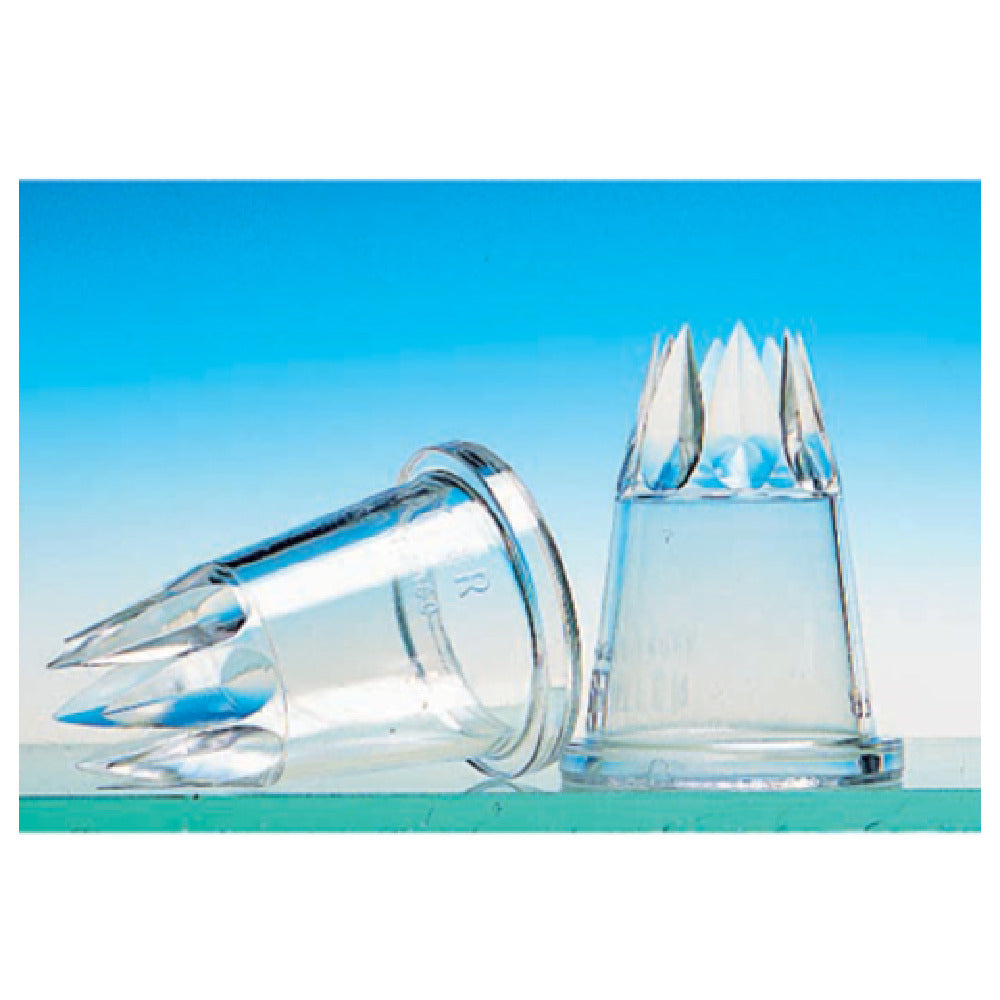 The Matfer 167044 Decorating Tube Tip 9/32" (7mm) Dia. Star Shaped is a high-quality tool designed for precision in cake and pastry decoration. With a diameter of 9/32" (7mm) and a distinctive star shape featuring 7 teeth, this tube tip is crafted from durable polycarbonate, ensuring long-lasting performance and resistance to wear. Its transparent design allows for easy monitoring of icing flow, providing decorators with greater control and accuracy in their work. Packaged as a set of two, the Matfer 167044 is identified with tube number D7, offering a practical and convenient option for professional bakers and enthusiastic home decorators alike. This decorating tube tip's unique construction supports a range of creative possibilities, making it an essential tool for those looking to create intricate designs and textures in icing and frosting applications. Suitable for diverse market segments within the culinary industry, from high-end patisseries to artisanal home kitchens, the Matfer 167044 Decorating Tube Tip stands out for its blend of precision, quality, and versatility, catering to the varied needs of professionals and hobbyists who prioritize excellence in their decorative presentations.