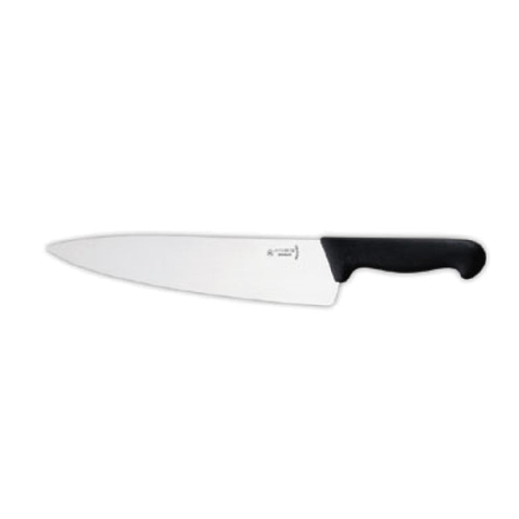 The Matfer 182112 Giesser Messer Chefs Knife is a professional-grade kitchen tool featuring a 7-3/4" blade length, crafted from high-quality chrome-molybdenum steel, ensuring exceptional durability and sharpness. This knife is engineered with a non-slip comfort grip, thanks to its black thermoplastic elastomer handle, which is both ergonomic and non-porous, providing enhanced safety and hygiene during use. Made in Germany, a country renowned for its precision engineering and superior craftsmanship, the Matfer 182112 is designed to meet the rigorous demands of professional chefs and culinary enthusiasts alike. The knife's robust construction and superior materials make it a versatile choice for a range of culinary tasks, from slicing and dicing to more intricate food preparation techniques. Its ergonomic design not only enhances user comfort but also ensures sustained performance, making it an indispensable tool in both commercial kitchens and home cooking environments. With its blend of functionality, safety, and manufacturer excellence, the Matfer 182112 Giesser Messer Chefs Knife stands out as a reliable and essential component in any culinary setting, catering to chefs who prioritize precision and quality in their culinary tools.