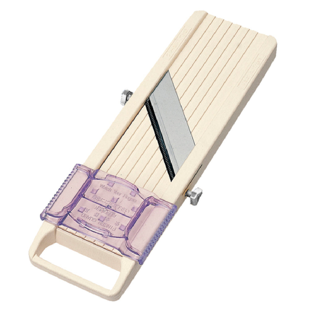 The Matfer 186700MC Benriner "Little Beni" Mandoline Slicer is a compact and efficient kitchen tool, measuring 12-1/2"L x 3-1/2"W, ideal for a range of culinary applications. This model comes equipped with three stainless steel blades, ensuring precise and consistent slicing for different types of vegetables and fruits. It also includes a safety pusher, enhancing user safety during operation. Constructed from durable polypropylene, the "Little Beni" Mandoline Slicer offers resilience and longevity, ideal for both professional chefs and home cooking enthusiasts. Made in Japan, this slicer embodies high-quality craftsmanship and design. Its compact size makes it a practical choice for kitchens with limited space, while still providing the functionality needed for efficient food preparation. The Matfer 186700MC is packed by the case, with 36 units per case, catering to larger scale needs within the food service industry. This mandoline slicer is a valuable tool for culinary professionals seeking precision and reliability, as well as home cooks desiring professional-grade equipment.