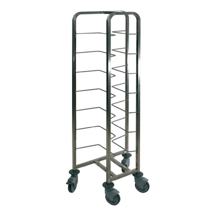 The Matfer 779108 Dough Container Trolley is a versatile and durable solution for efficiently storing and transporting dough containers in commercial kitchens and bakeries. With dimensions of 14-1/2 inches in length, 23-1/4 inches in width, and 70-1/2 inches in height, this trolley is designed to accommodate up to eight dough containers, making it an ideal choice for operations with high-volume needs. Constructed from robust stainless steel, the trolley ensures longevity and resistance to wear and tear in demanding environments. It is equipped with four casters, two of which have brakes, allowing for easy mobility and secure positioning when needed. The 7-1/4 inch rack spacing facilitates easy access and organization of containers, enhancing workflow efficiency. This dough container trolley is particularly valuable for bakeries, pizzerias, and any food service establishment that requires systematic dough handling and storage solutions. The combination of its large capacity, mobile functionality, and sturdy construction makes the Matfer 779108 Dough Container Trolley a practical asset in maintaining operational efficiency and ensuring the quality of dough handling processes across various segments of the food industry.