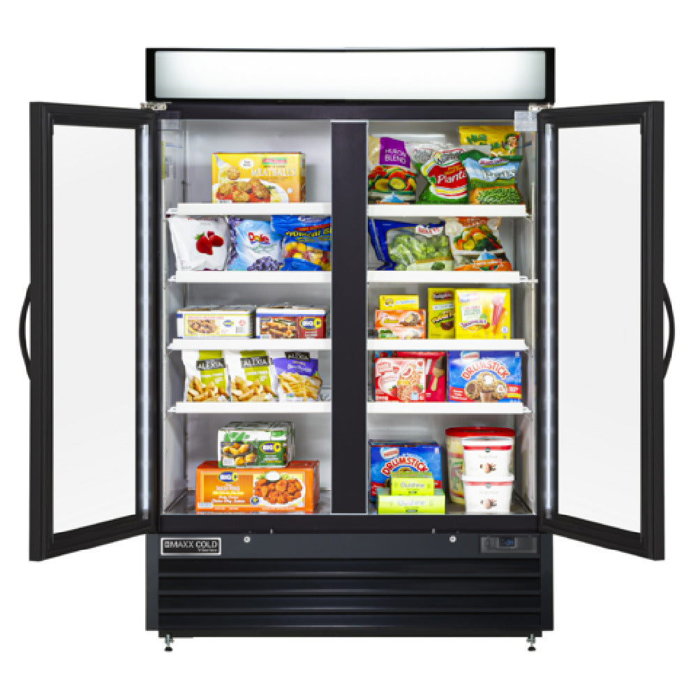 Maxximum, MVMF48B, Maxx Cold V-Series Ice Merchandiser Freezer, 54"W, 48 cu. ft., (2) glass doors, (8) adjustable heavy-duty PE-coated wire shelves, digital controls, LED display, black powder coated steel exterior and powder coated aluminum interior, self- contained bottom mounted compressor, R290a, cETLus, ETL-Sanitation (MVMF48B)