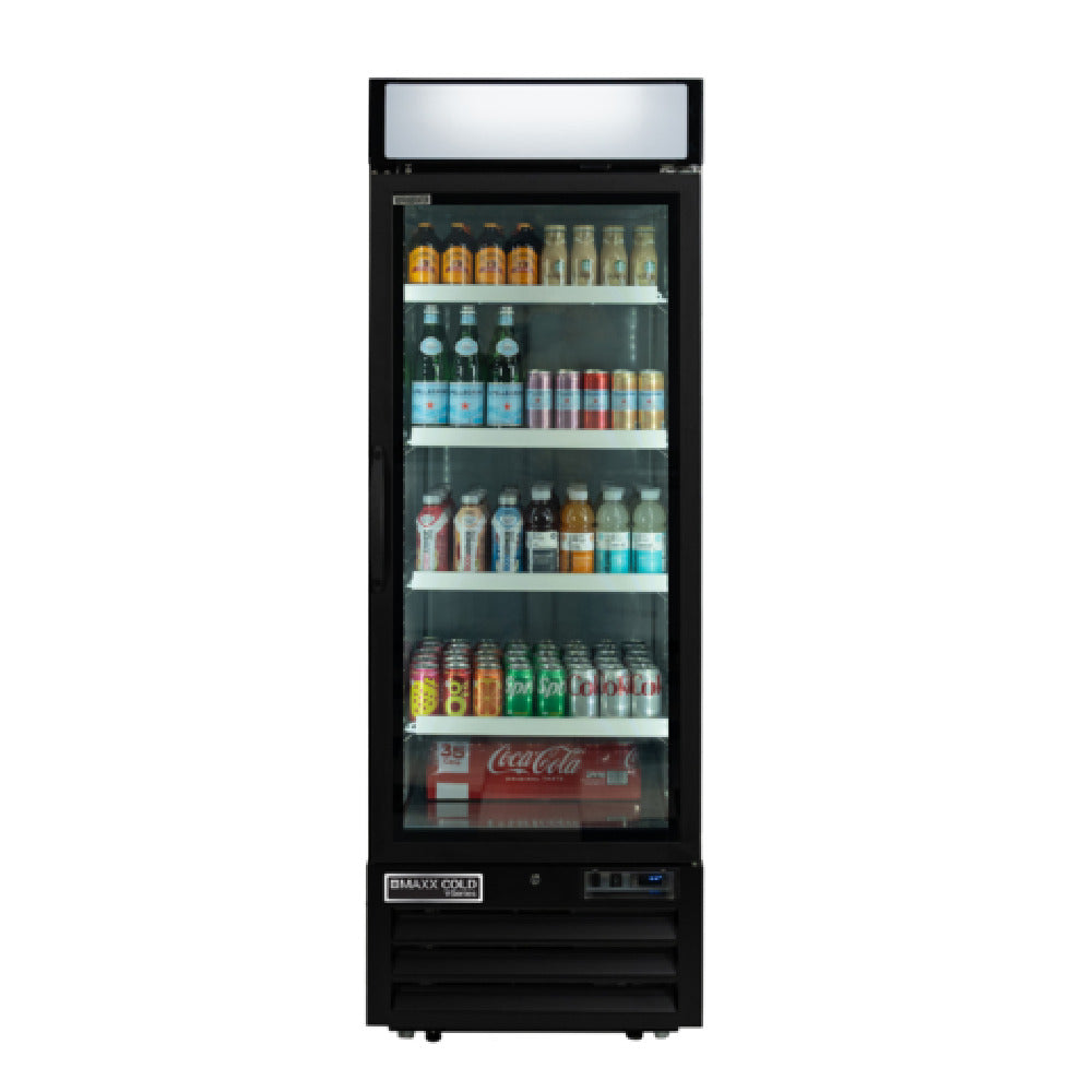 Maxximum, MVMR23B, Maxx Cold V-Series Merchandiser Refrigerator, 27"W, 23 cu. ft., (1) glass door, (4) adjustable heavy-duty PE-coated wire shelves, black powder coated steel exterior and powder coated aluminum interior, self-contained bottom mounted compressor, R290a, cETLus, ETL-Sanitation (MVMR23B)