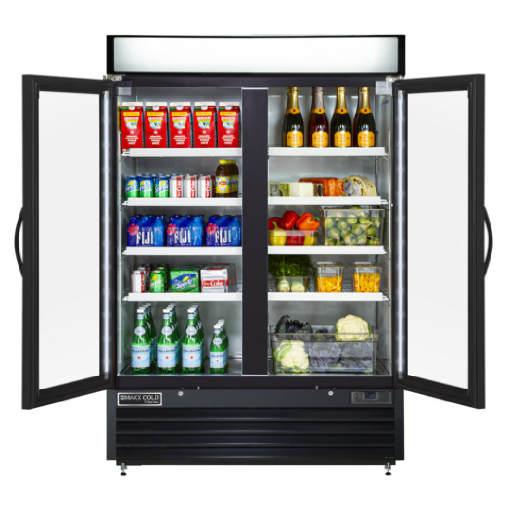 Maxximum, MVMR48B, Maxx Cold V-Series Merchandiser Refrigerator, 54"W, 48 cu. ft. (2) glass doors, (8) adjustable heavy-duty PE-coated wire shelves, black powder coated steel exterior and powder coated aluminum interior, self-contained bottom mounted compressor, R290a, cETLus, ETL-Sanitation (MVMR48B)