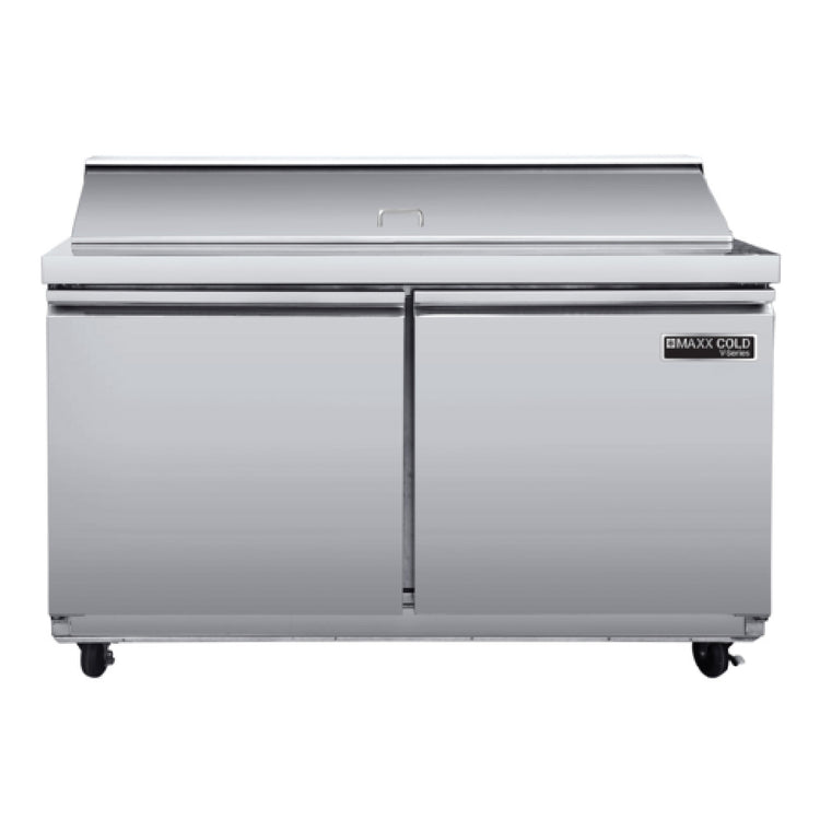 Maxximum, MVR48SHC, Maxx Cold V-Series Refrigerated Sandwich and Salad Prep Station, 48"W, 13.2 cu ft, (2) solid doors, (12) 4" deep 1/6 GN pans included, 11.42” deep polyethylene cutting board, adjustable heavy-duty wire shelves (1 per section/door), stainless steel exterior and powder coated aluminum interior construction, R290a, cETLus, ETL-Sanitation (MVR48SHC)