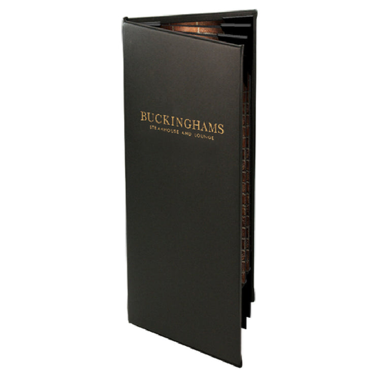 Menu Solutions, MAJ60BD, Menu Cover, holds 4-1/4" x 14" inserts, quad panel booklet with 6 views, metal-look material front, turned edge finish, no stitching, hot foiled stamped/debossed logo on front cover (up to 45 sq. inches, includes all plate, die, stamp, and set-up charges) Majestic (priced per each, minimum order 25) (Packed By: 25 Each Per Case)
