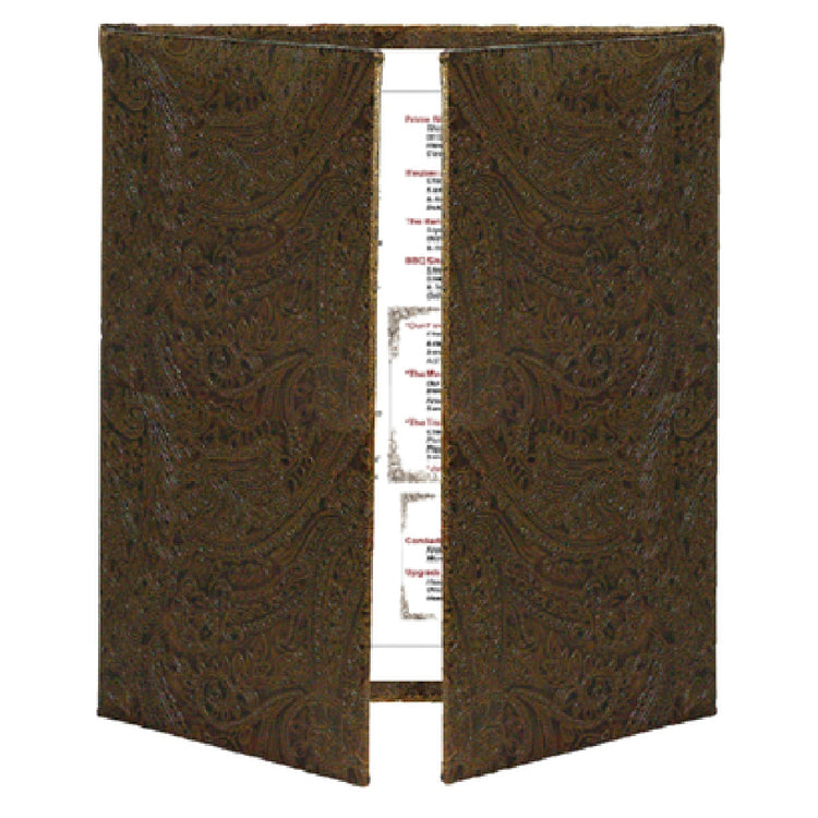 Menu Solutions, PA55C, Menu Cover, holds 4-1/4", 8-1/2", 4-1/2" x 11" inserts, gatefold style with 3 views, textured two-toned leather like vinyl, includes logo on standard size window (up to 45 sq. inches, includes all plate, die stamp and set-up charges), Paisley (priced per each, minimum order 25) (Packed By: 25 Each Per Case)