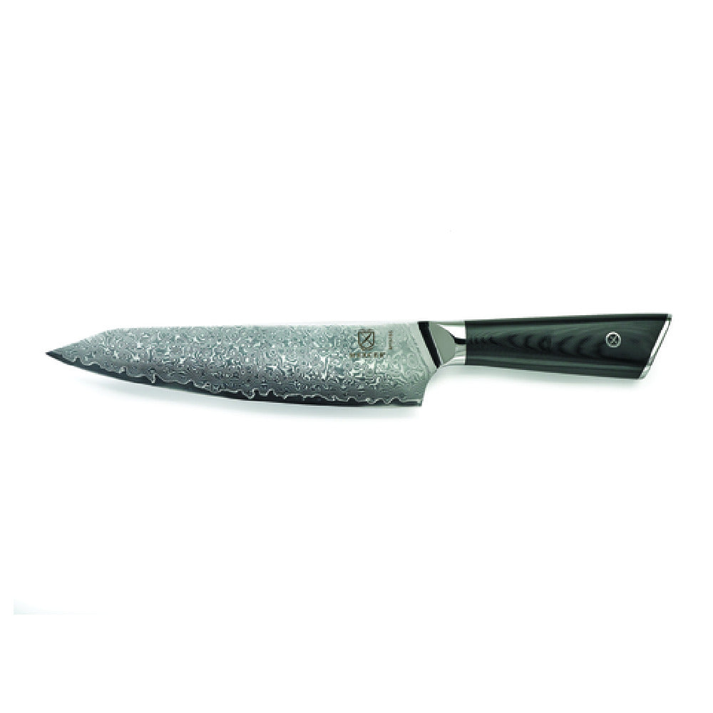 The Mercer Culinary M13785 Chef's Knife 8" with G10 handle is an exemplary tool designed for culinary professionals and cooking enthusiasts alike, offering precision and durability. The knife features an 8-inch super steel Damascus blade, renowned for its exceptional cutting performance and edge retention. With a high Rockwell hardness of HRC 62, this blade delivers remarkable sharpness and longevity, making it a reliable choice for a variety of kitchen tasks. The full tang construction ensures optimal balance and strength, enhancing the user's control and comfort during use. The G10 handle, crafted from a fiberglass laminate material, is known for its superior durability and resistance to moisture, providing a secure and comfortable grip even in demanding kitchen environments. This expertly crafted knife is tailored to meet the needs of different segment markets within the culinary industry, from professional chefs seeking precision and reliability to home cooks desiring a high-quality cutting instrument. The Mercer Culinary M13785 Chef's Knife combines advanced material technology with meticulous craftsmanship, making it an indispensable tool in any kitchen, whether in a bustling restaurant or a home setting, where performance and quality are paramount.