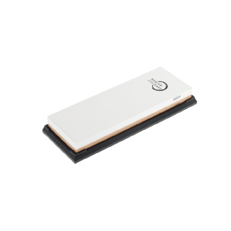 The Mercer Culinary M15971 Premium Restoration Sharpening Stone measures 7-7/8" x 2-3/4" x 1", providing a substantial surface area for efficient sharpening. This versatile tool is a 240/800 grit combination stone, making it suitable for both initial grinding and fine honing of blades. Constructed from premium grade corundum, the stone ensures durability and effective sharpening performance. It includes a silicone base holder, which aids in stability and ease of use while sharpening. This sharpening stone is an essential tool for culinary professionals, home chefs, and knife enthusiasts, who require precision and quality in their cutting tools. The dual grit feature accommodates various sharpening needs, from restoring heavily dulled edges to polishing sharp blades to a fine finish. Its substantial size and premium materials make it a reliable choice for maintaining the integrity and sharpness of kitchen knives and other cutting instruments. With its focus on quality construction and practical design, the Mercer Culinary M15971 offers a unique value proposition for different segment markets within the culinary industry, catering to both commercial kitchens and individual users who demand high-performance sharpening solutions.