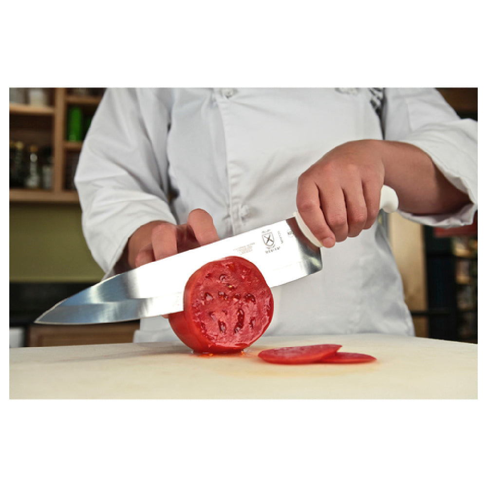 The Mercer Culinary M18120 Ultimate White® Chef Knife 10" Stamped stands as a testament to precision and ergonomic design, catering to the diverse needs of culinary professionals across various segments of the industry. This chef knife features a 10-inch blade crafted from high carbon, Japanese steel, renowned for its durability and ability to maintain an exceptionally sharp edge, making it an essential tool for both professional chefs and culinary enthusiasts. The stamped construction of the blade ensures a lightweight feel without compromising on performance, providing ease of handling during extended use. The knife is equipped with an ergonomic white handle, designed for comfort and control, incorporating textured finger points and a protective finger guard to enhance grip and prevent accidents. As an NSF-certified product, it adheres to stringent public health standards, making it a reliable choice for professional kitchens where safety and hygiene are paramount. The Mercer Culinary M18120 is an exemplary combination of form and function, embodying the precise craftsmanship and innovative design necessary to meet the high demands of the food service industry.