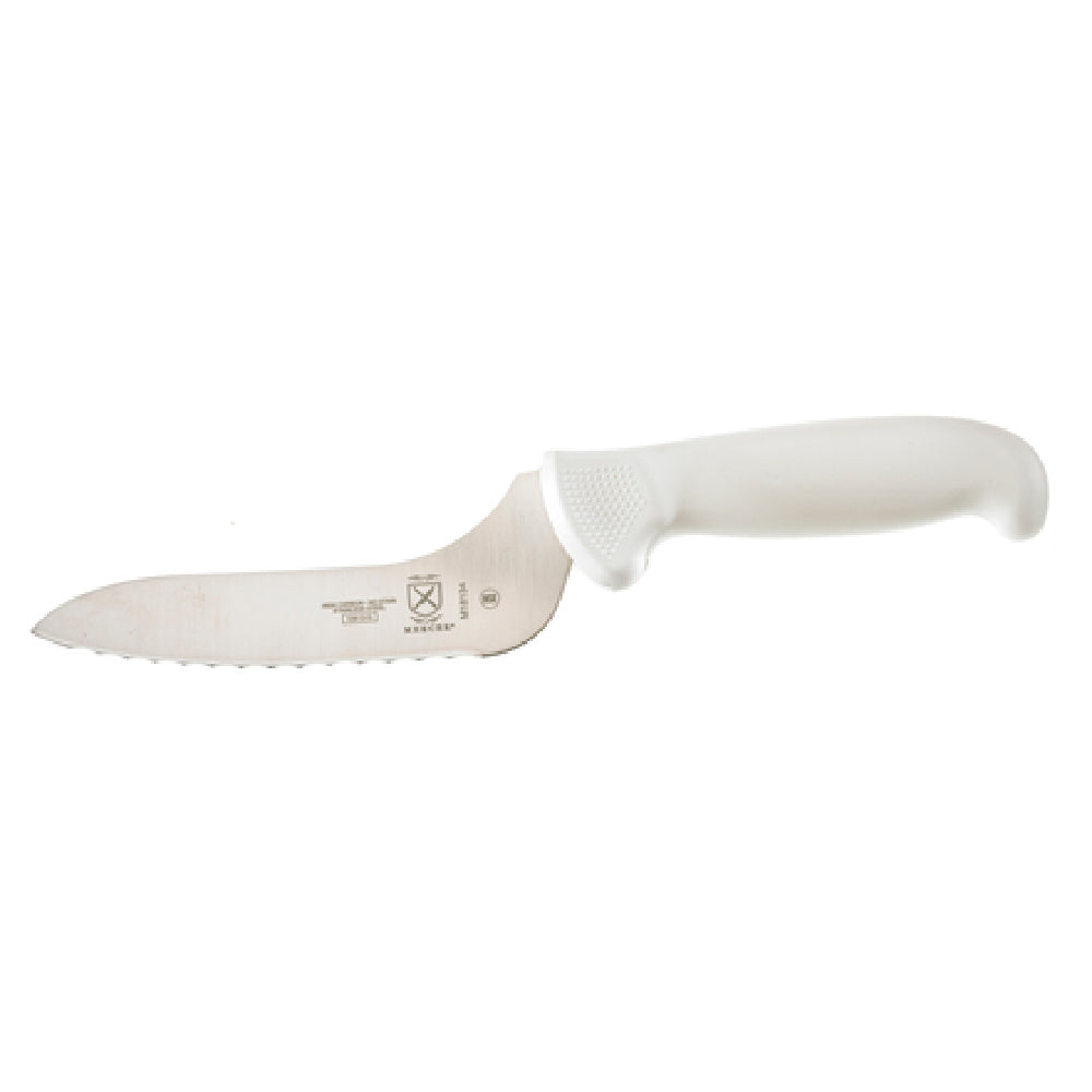 The Mercer Culinary M18134 Ultimate White® Bread Knife 6" Stamped is an expertly crafted tool designed for precision and durability in food preparation. This knife features a 6-inch stamped blade constructed from high-carbon Japanese steel, known for its exceptional edge retention and sharpness, making it ideal for the rigorous demands of both professional and home kitchens. The offset handle design provides enhanced knuckle clearance, allowing for more efficient and comfortable cutting motions, particularly beneficial in busy kitchen environments. Its wavy edge is specifically engineered to easily slice through bread without crushing, maintaining the integrity of each slice. The ergonomic white plastic handle is designed with textured finger points, offering a secure grip and reducing the risk of slippage during use. A protective finger guard adds an extra layer of safety, making it suitable for high-paced culinary settings. This bread knife is NSF certified, which verifies its compliance with public health and safety standards, a significant consideration for commercial kitchen use. The Mercer Culinary M18134 is a versatile knife that caters to the unique needs of different market segments within the culinary industry, from artisan bakers to professional chefs, due to its combination of advanced design features and reliable performance.
