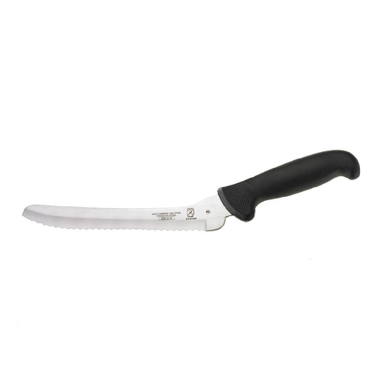 The Mercer Culinary M18135BK Ultimate White® Bread Knife - 8" Stamped is a precision tool crafted for both professional chefs and culinary enthusiasts. This expertly designed knife features an 8-inch blade made from high carbon Japanese steel, renowned for its durability and sharpness, which ensures long-lasting performance. The blade's wavy edge is engineered specifically for slicing through bread with ease, maintaining the integrity of the loaf without crushing the softer interior. An offset handle design enhances user comfort and safety by keeping knuckles clear of the cutting surface. This ergonomic handle is crafted from black plastic, providing a secure grip, further assisted by textured finger points and a protective finger guard. The knife's stamped construction contributes to its lightweight nature, facilitating effortless handling and control. Certified by NSF, the Mercer Culinary M18135BK Ultimate White® Bread Knife meets rigorous public health standards, ensuring it is a reliable choice for use in commercial kitchens and home settings alike. Its combination of high-quality materials, ergonomic design, and precision engineering makes it a valuable addition to any culinary toolkit, offering exceptional performance and safety for bread slicing tasks in various food service environments.