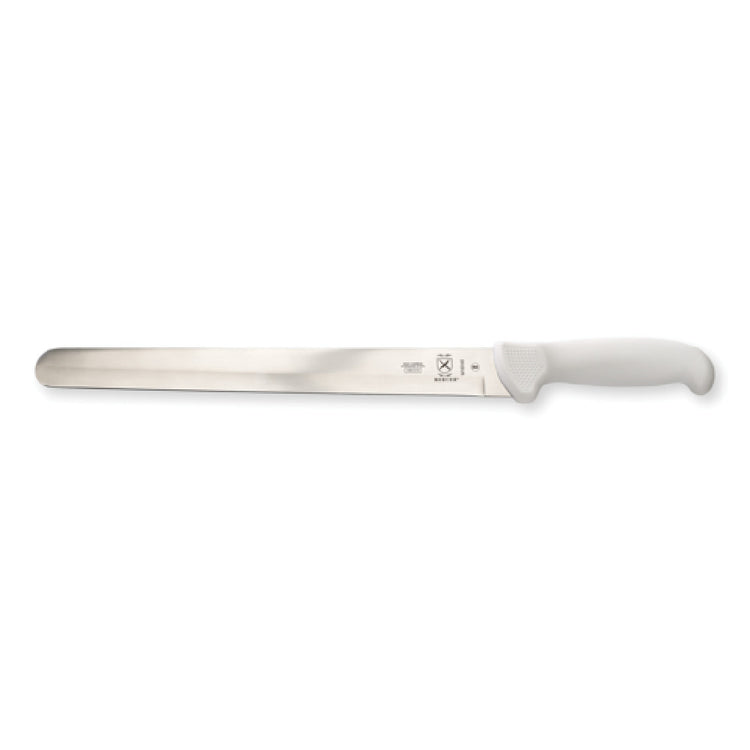 The Mercer Culinary M18146 Ultimate White® Slicer 12" Stamped is a precision-engineered kitchen tool, ideal for professionals and culinary enthusiasts alike. Crafted from high carbon Japanese steel, this slicer boasts exceptional durability and sharpness, ensuring clean and efficient cutting performance. The 12-inch blade is stamped for a lightweight feel and agile handling, making it perfect for slicing through various foods with ease. Its plain edge design facilitates smooth and precise cuts, catering to a wide array of culinary applications. The ergonomic white polypropylene handle provides a comfortable grip, enhanced by its textured finger points for added control and safety. A protective finger guard is integrated into the design, highlighting the slicer's commitment to user safety during intense kitchen operations. This slicer is NSF certified, confirming its adherence to rigorous public health and safety standards, making it suitable for both commercial kitchens and home use. The Mercer Culinary M18146 Ultimate White® Slicer represents a fusion of innovative design and superior materials, meeting the diverse needs of different market segments within the culinary industry.