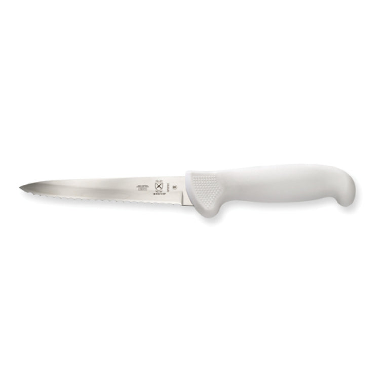 The Mercer Culinary M18165 Ultimate White® Utility Knife 5" Stamped is a meticulously crafted tool designed to meet the diverse needs of culinary professionals and enthusiasts alike. Featuring a 5-inch blade, this utility knife is constructed from high carbon Japanese steel, renowned for its durability and sharpness, making it ideal for precise cutting tasks. The blade's wavy edge enhances its slicing capabilities, providing effortless and clean cuts through various types of food. The knife is stamped, ensuring a lightweight feel that reduces hand fatigue during extended use. Its ergonomic white polypropylene handle is thoughtfully designed with textured finger points, offering a secure and comfortable grip. Additionally, the handle includes a protective finger guard, enhancing safety during use. The knife is certified by NSF, highlighting its adherence to stringent public health standards, making it a reliable choice for both commercial kitchens and home cooks. The Mercer Culinary M18165 Ultimate White® Utility Knife's combination of high-quality materials, ergonomic design, and safety features make it a versatile and essential tool for any kitchen environment, accommodating the specific demands of chefs, culinary students, and cooking enthusiasts who prioritize precision and ease of use in their cutting instruments.