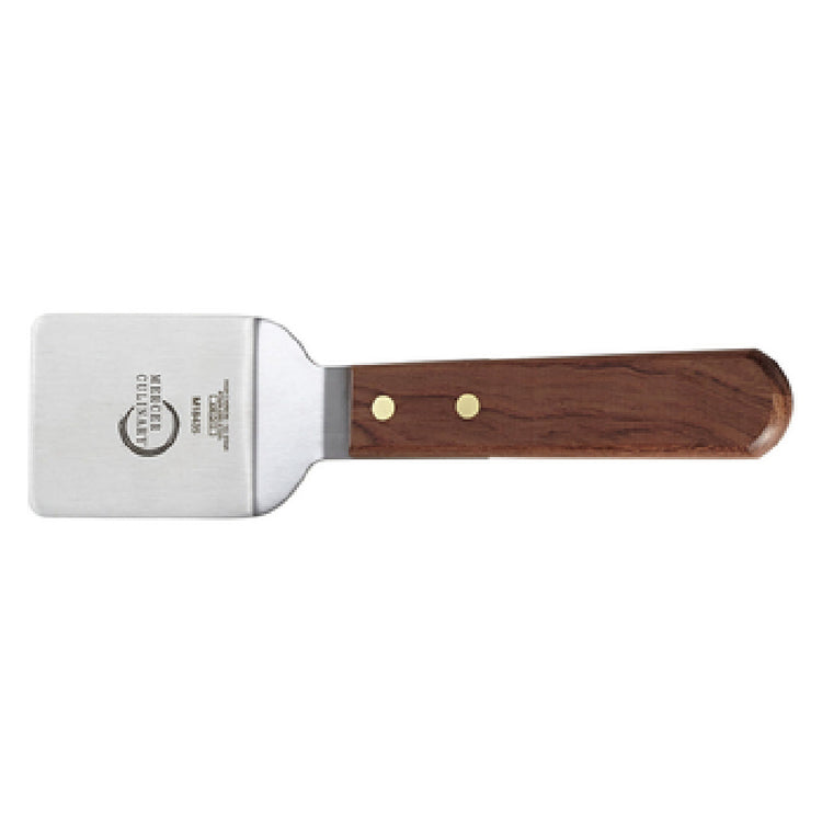 The Mercer Culinary M18435 Praxis® Mini Turner stands out as an essential tool for culinary professionals and home cooks alike, combining precision engineering with high-quality materials for unparalleled performance. Measuring 2-1/2 inches by 2-1/2 inches with an overall length of 8-1/2 inches, this mini turner is designed for precision and control in tight spaces and delicate cooking tasks. Its blade is crafted from high carbon, Japanese stainless steel, renowned for its strength, durability, and sharpness retention, ensuring it can withstand rigorous use in busy kitchens. The turner's handle is constructed from rosewood, providing not only an aesthetically pleasing finish but also a comfortable grip for extended use. It is secured with two brass compression rivets, enhancing the tool's structural integrity. This mini turner's thoughtful design and robust construction make it a versatile addition to any kitchen, whether used in professional culinary environments or by passionate home chefs. Its compact size and superior material quality cater to various market segments, from restaurant kitchens requiring durable, reliable tools to home users seeking high-performance kitchen utensils. The Mercer Culinary M18435 Praxis® Mini Turner is a testament to quality craftsmanship and functional design, offering enduring value across different culinary applications.