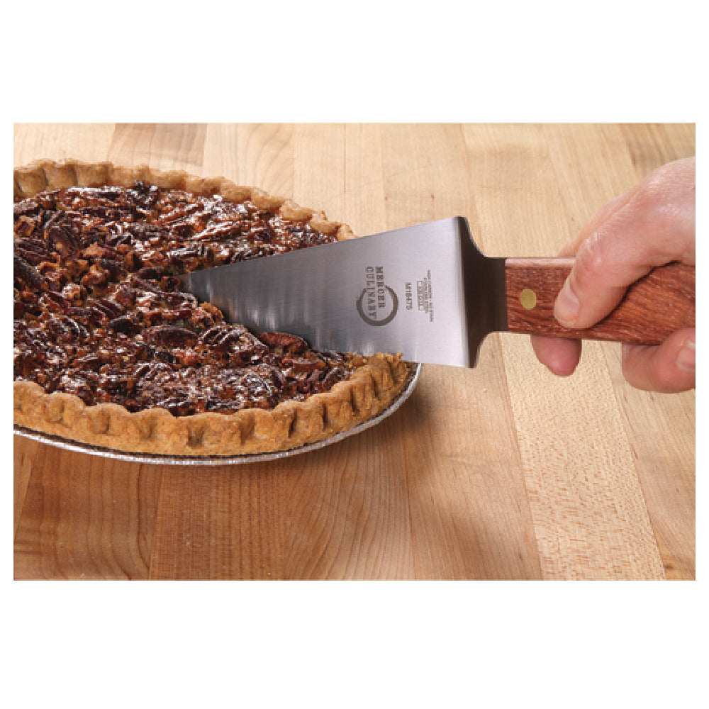 The Mercer Culinary M18475 Praxis® Pie Server is a precision-crafted tool recognized for its exceptional quality and functionality in professional and home kitchens alike. With a blade dimension of 5 inches by 2 inches and an overall length of 10-1/2 inches, this pie server is designed to provide optimal control and efficiency during use. The high-carbon, Japanese stainless steel blade is engineered for durability and sharpness, ensuring clean cuts and ease of pie serving. Complementing its robust blade, the handle is fashioned from elegant rosewood, offering a comfortable grip while enhancing the tool's visual appeal. The handle is secured with two brass compression rivets, adding strength and longevity to the server's construction. Ideal for use in bakeries, catering services, and restaurants, the Mercer Culinary M18475 Praxis® Pie Server combines traditional craftsmanship with modern materials to deliver a reliable and stylish serving solution. Its design considerations make it suitable for various market segments, from professional chefs demanding high-performing tools to passionate home bakers appreciating quality kitchenware. This pie server stands out for its impeccable balance of form and function, making it a valuable addition to any culinary setting.