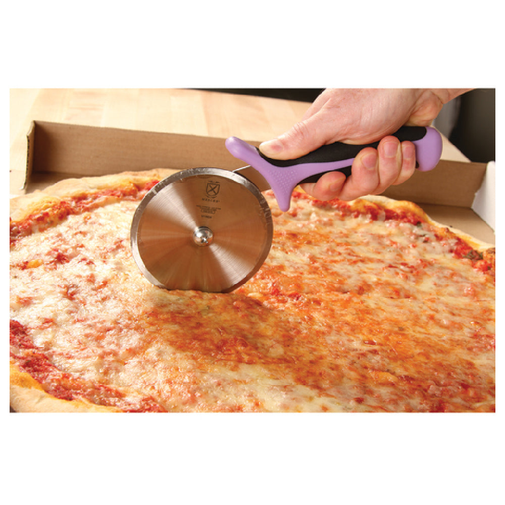 The Mercer Culinary M18604PU Millennia® Pizza Cutter - 4" Blade is a specialized kitchen tool designed to meet the demanding needs of both professional chefs and home cooking enthusiasts. Featuring a high-carbon Japanese steel blade, this pizza cutter is engineered for durability and precision cutting. The precision ground edge of the 4-inch blade ensures clean, efficient slicing of pizzas, reducing the effort required in busy kitchen environments. The ergonomic handle, crafted from a combination of Santoprene® and polypropylene, offers a comfortable and secure grip, making it an ideal choice for prolonged use. The vibrant purple handle not only adds a splash of color but also helps in easy identification among kitchen utensils. This tool is designed for those who value quality and precision, making it perfectly suited for various market segments, including pizzerias, restaurants, and home kitchens. The Mercer Culinary M18604PU Millennia® Pizza Cutter embodies a balance of superior craftsmanship and functional design, delivering exceptional performance and value in the culinary industry.