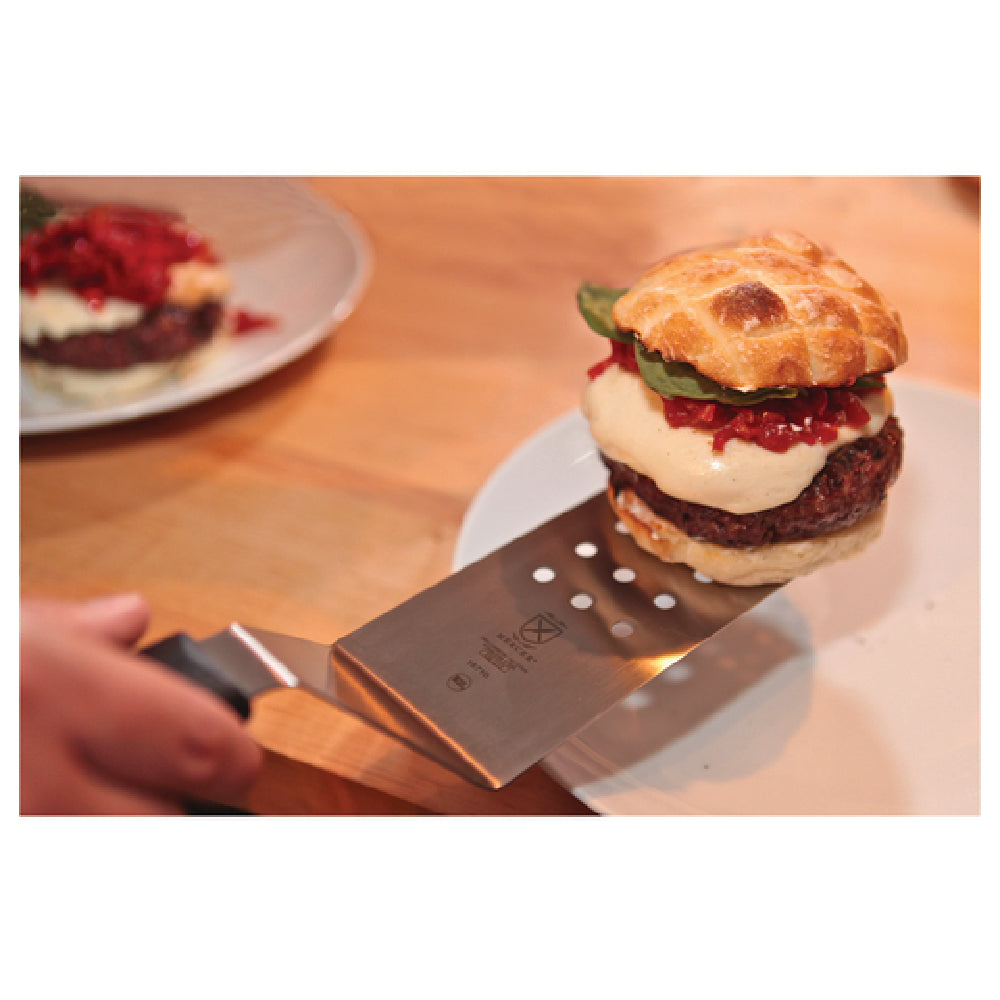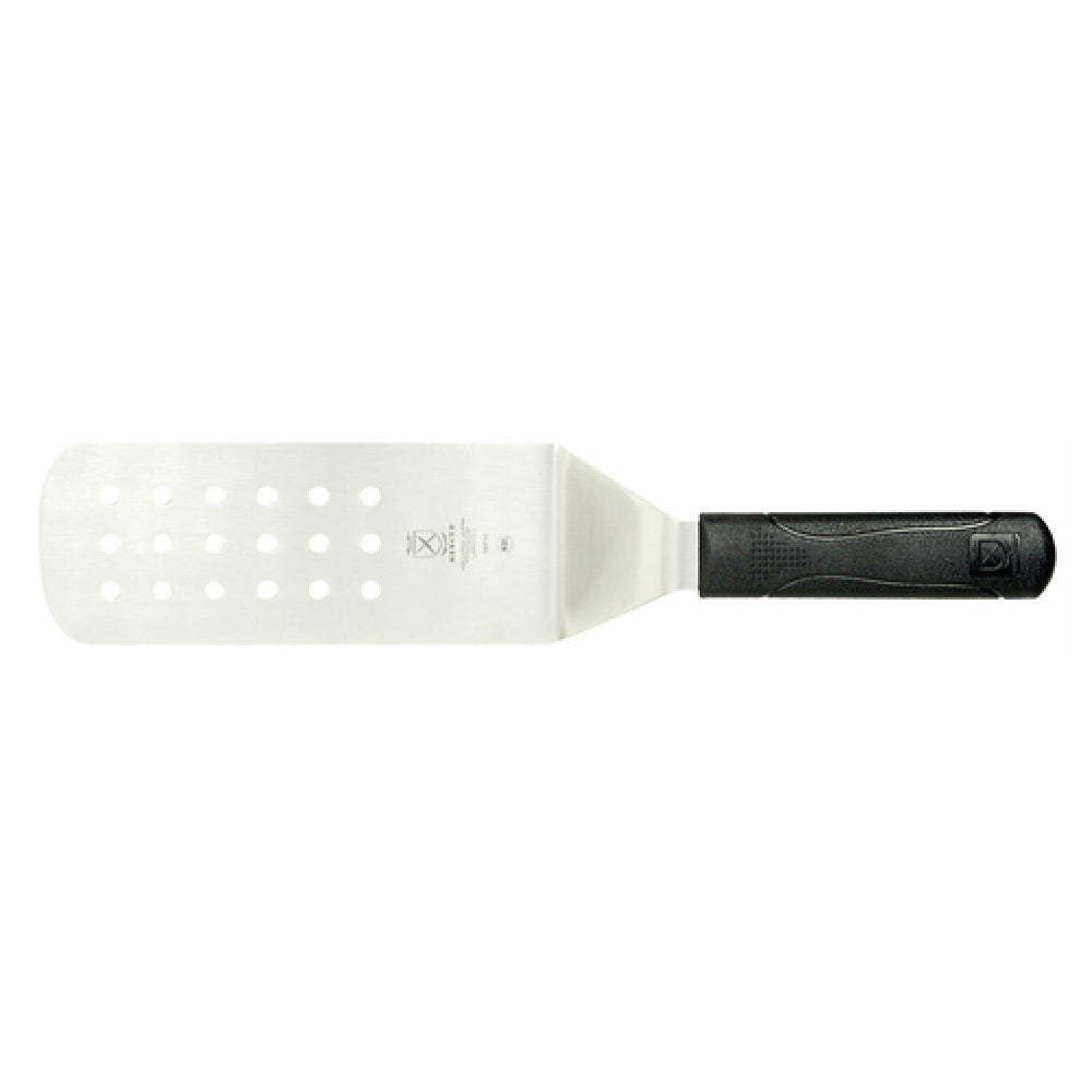 The Mercer Culinary M18710 Millennia® Turner is a versatile kitchen tool designed with precision and durability in mind, ideal for a range of culinary professionals. Featuring an 8-inch long and 3-inch wide perforated blade made from high-quality Japanese steel, this turner ensures superior strength and sharpness, contributing to a seamless cooking experience. The overall length of 14-3/4 inches provides an extended reach, making it suitable for various cooking techniques and tasks. The black molded polypropylene handle offers an extra-sure grip, reducing the risk of slippage and enhancing control during use. The ergonomic design ensures comfort, even during prolonged periods of handling. Certified by NSF, this turner meets rigorous public health and safety standards, making it an excellent choice for both commercial and home kitchens. The Mercer Culinary M18710 Millennia® Turner stands out as a reliable and indispensable tool for chefs, line cooks, and culinary enthusiasts who require precision and durability in their kitchen utensils. With its thoughtful design and high-quality materials, this turner efficiently combines functionality with safety, ensuring it can withstand the demands of a fast-paced culinary environment.