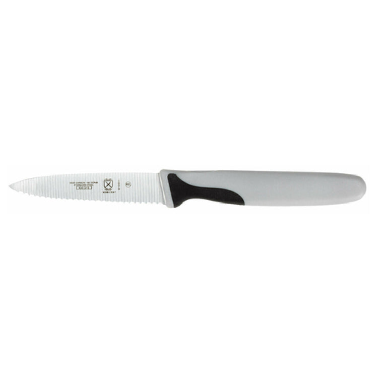 The Mercer Culinary M19903 Millennia® Paring Knife 3" Slim is a meticulously crafted tool designed for precision and efficiency in the kitchen. Featuring a 3-inch slim, serrated blade made from high carbon Japanese steel, this paring knife is engineered for superior performance and longevity. The blade's high carbon content significantly enhances its edge retention and sharpness, making it ideal for intricate slicing and peeling tasks. Equally important is its handle, composed of a blend of Santoprene® and polypropylene, ensuring a comfortable, non-slip grip even in wet conditions. The handle also includes textured finger points that not only provide additional grip security but also enhance user comfort. This ergonomic design reduces hand fatigue during extended use. Each pack contains three of these knives, making them a practical choice for culinary professionals who require reliable, high-quality tools. Certified by the NSF, this knife adheres to rigorous health and safety standards, making it a trusted choice for both commercial kitchens and home chefs. The Mercer Culinary M19903 Millennia® Paring Knife offers a blend of innovative design and functional excellence, suitable for various segments of the culinary industry that demand precision and durability.